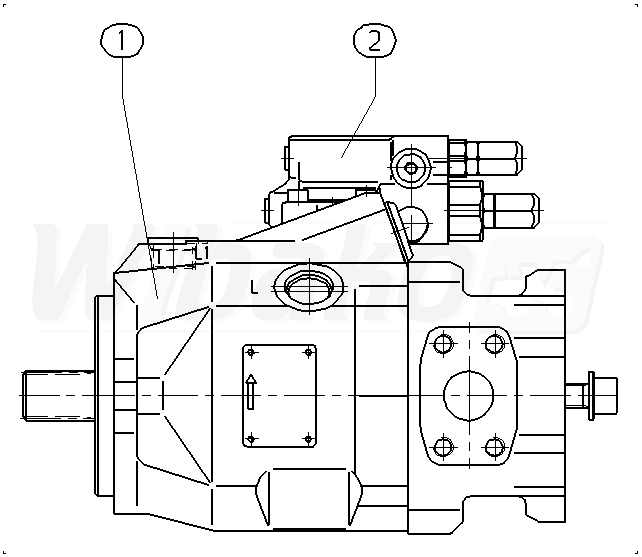 Axial piston variable pump A10VO, swashplate design, open circuit, nominal pressure 250 bar, maximum pressure 315 bar. Series 52. Geometric displacement 45 cm3. Pressure controller with pressure cut-off, hydraulic, remote controlled. Directions of rotation: counter-clockwise (viewed on drive shaft). Splined shaft ISO 3019-1, for higher torque. Mounting flange ISO 3019-1 (SAE) 2-hole. SAE flange ports, fastening thread metric, laterally opposite, for through drive.