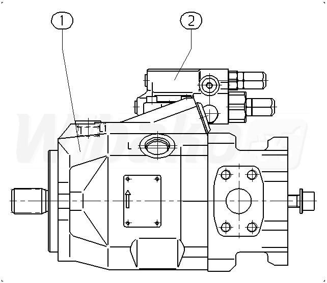 Axial piston variable pump A10VO, swashplate design, open circuit, nominal pressure 250 bar, maximum pressure 315 bar. Series 52. Geometric displacement 45 cm3. Pressure controller with pressure cut-off, hydraulic, remote controlled. Directions of rotation: counter-clockwise (viewed on drive shaft). Splined shaft ISO 3019-1, standard. Mounting flange ISO 3019-1 (SAE) 2-hole.