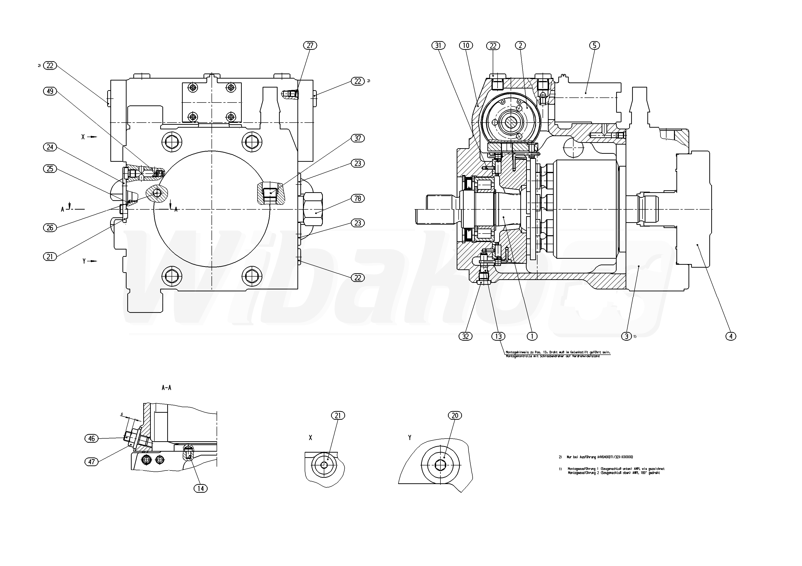 Axial piston variable pump A4VG. Geometric displacement 56 cm3. Proportional control, hydraulic, Pilot-pressure related p = 6 to 18 bar. Pressure cut-off. Without DA control valve. Series 3, index 2. Direction of rotation (viewed on drive shaft): counter-clockwise. Sealing material: NBR (nitrile rubber), shaft seal in FKM (fluoroelastomer). Splined shaft ANSI B92.1a for combination pump – 1st pump. Mounting flange SAE J744 2-hole.