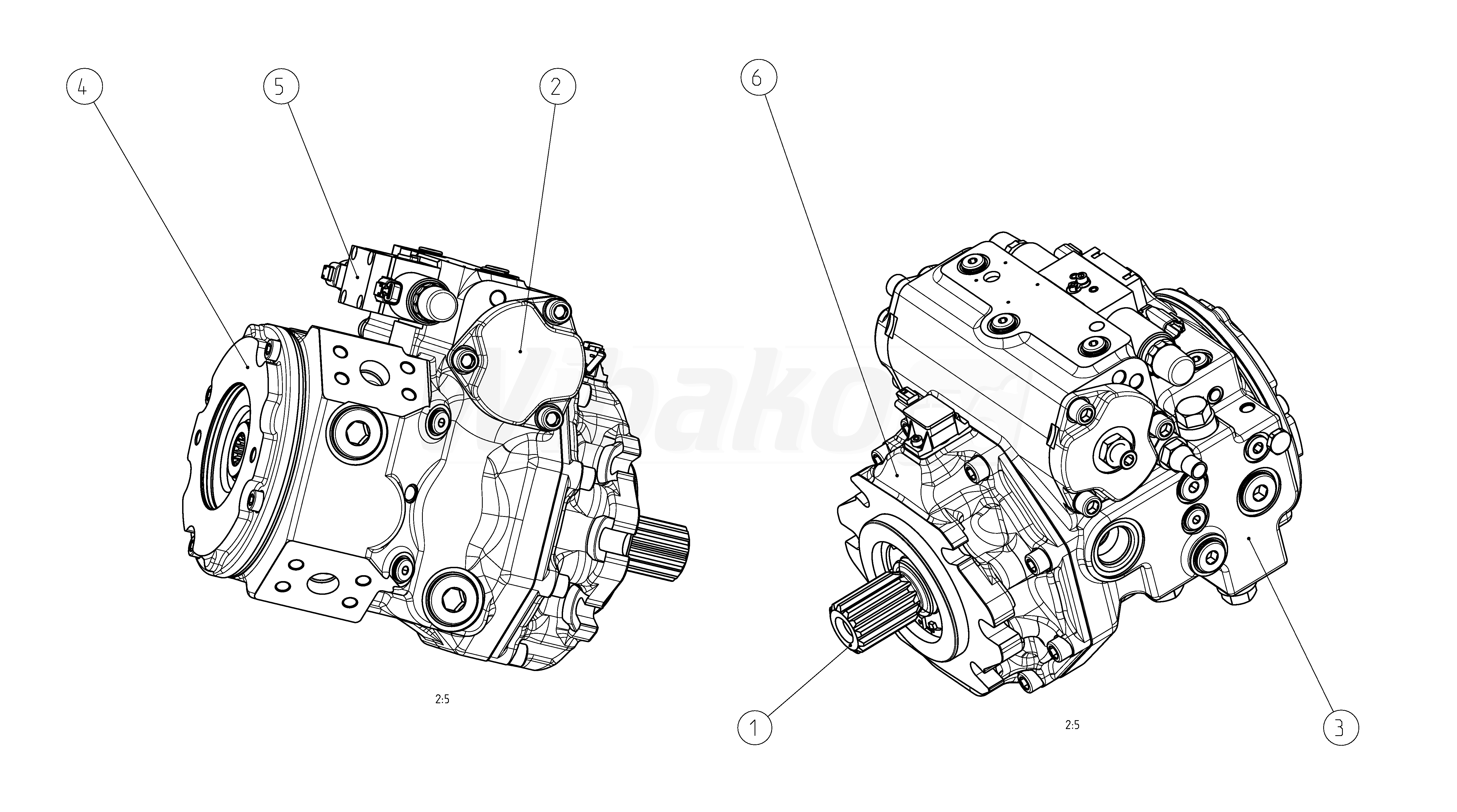 Axial piston variable pump A4VG, swashplate design, nominal pressure 450 bar, maximum pressure 500 bar. Pump, closed circuit. Geometric displacement 085 cm3. Proportional control, electric with manual override and spring return U = 24 V. Pressure cut-off, with bypass. Fixed setting, hydraulic, mechanical. DEUTSCH molded connector, 2-pin – without suppressor diode. Electric swivel angle sensor (DWS20-1, 3-pin). Without additional function. Without DA control valve. Series 40. Metric ports according to ISO 6149 with O-ring seal, metric fastening thread according to DIN 13. Direction of rotation: clockwise (viewed on drive shaft). Sealing material: NBR (nitrile rubber), shaft seal in FKM (fluoroelastomer). Mounting flange SAE J744 127-2/4. Splined shaft ANSI B92.1a–1976 1 3/4 in 13T 8/16DP. SAE working port A and B, on left side (45° left). Standard rotary group, boost pump integrated, large internal gear pump. Flange SAE J744: diameter- 101-2 (B), mounting- horizontal, code- B2. Hub for splined shaft: diameter- 7/8 in 13T 16/32DP, code- S5. High-pressure relief valve, direct operated, fixed setting, with low-pressure relief valve, fixed setting. Filtration in the boost pump suction line.