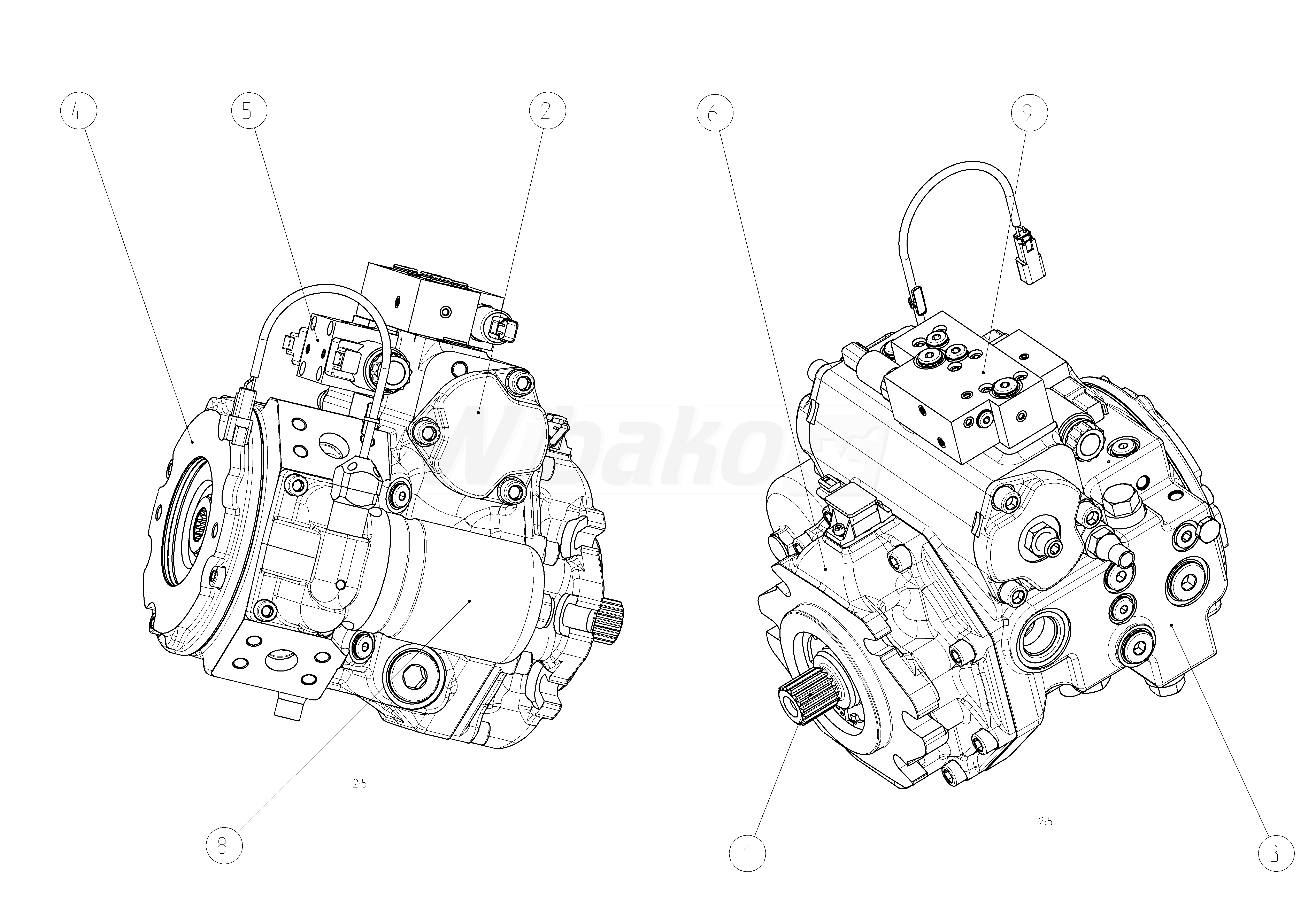 Axial piston variable pump A4VG, swashplate design, nominal pressure 450 bar, maximum pressure 500 bar. Pump, closed circuit. Geometric displacement 085 cm3. Series 40. Metric ports according to ISO 6149 with O-ring seal, metric fastening thread according to DIN 13. Direction of rotation: clockwise (viewed on drive shaft). Sealing material: NBR (nitrile rubber), shaft seal in FKM (fluoroelastomer). Mounting flange SAE J744 127-2/4. SAE working port A and B, on left side (45° left). Standard rotary group, boost pump integrated, standard internal gear pump. Flange SAE J744: diameter- 101-2 (B), mounting- horizontal, code- B2. Hub for splined shaft: diameter- 7/8 in 13T 16/32DP, code- S5. High-pressure relief valve, direct operated, fixed setting, with low-pressure relief valve, fixed setting. Filtration in the boost pump pressure line. Attachment filter with cold start valve and electric contamination indicator – DEUTSCH connector.