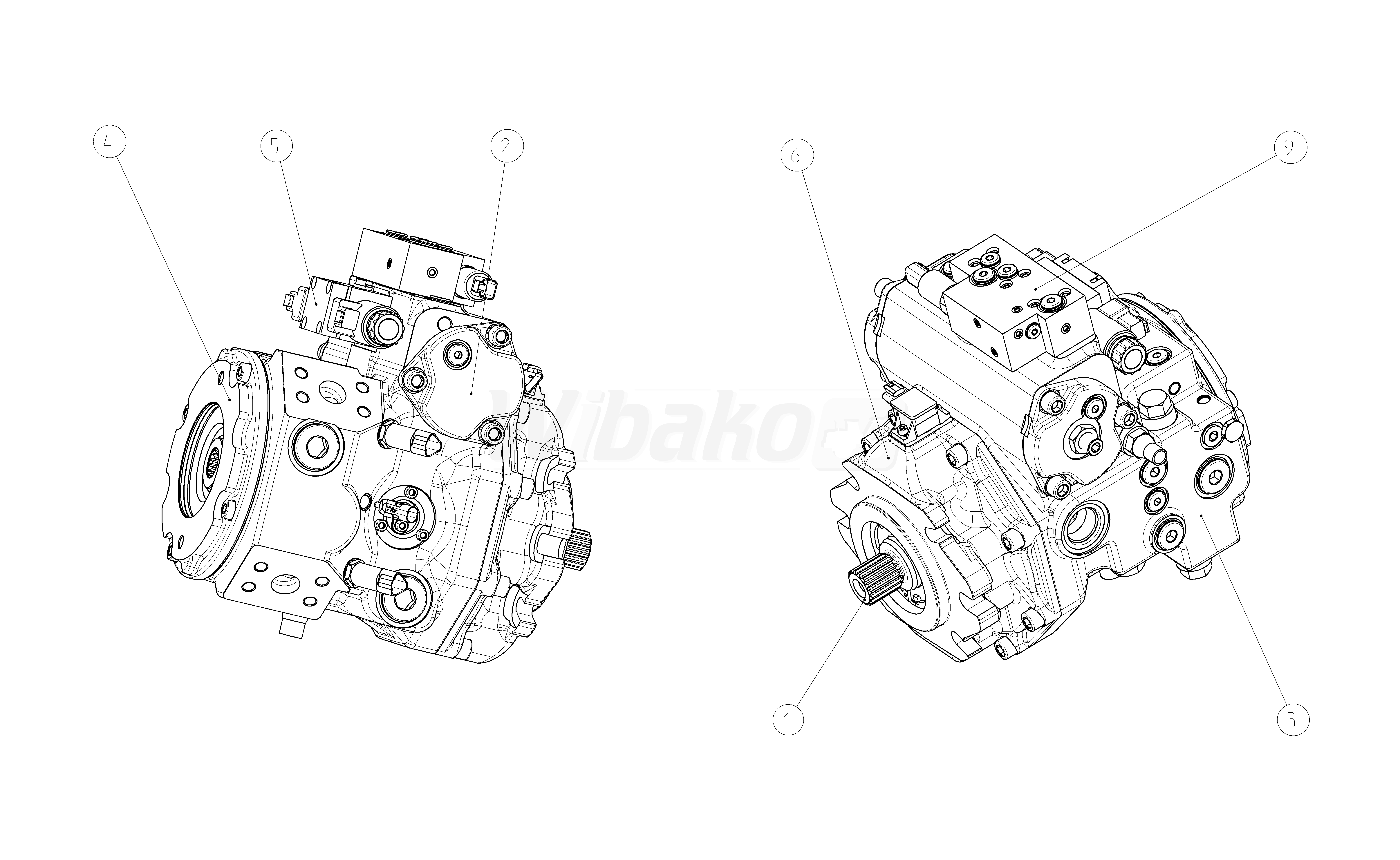 Axial piston variable pump A4VG, swashplate design, nominal pressure 450 bar, maximum pressure 500 bar. Pump, closed circuit. Geometric displacement 085 cm3. Series 40. Metric ports according to ISO 6149 with O-ring seal, metric fastening thread according to DIN 13. Direction of rotation: clockwise (viewed on drive shaft). Sealing material: NBR (nitrile rubber), shaft seal in FKM (fluoroelastomer). Mounting flange SAE J744 127-2/4. SAE working port A and B, on left side (45° left). Standard rotary group, boost pump integrated, standard internal gear pump. Flange SAE J744: diameter- 101-2 (B), mounting- vertical, code- B1. Hub for splined shaft: diameter- 7/8 in 13T 16/32DP, code- S5. High-pressure relief valve, direct operated, fixed setting, with low-pressure relief valve, fixed setting. Filtration in the boost pump suction line. Witch pressure sensors at the measuring ports MA and MB (high pressure). Witch speed sensor DSM, DSA. Special version.
