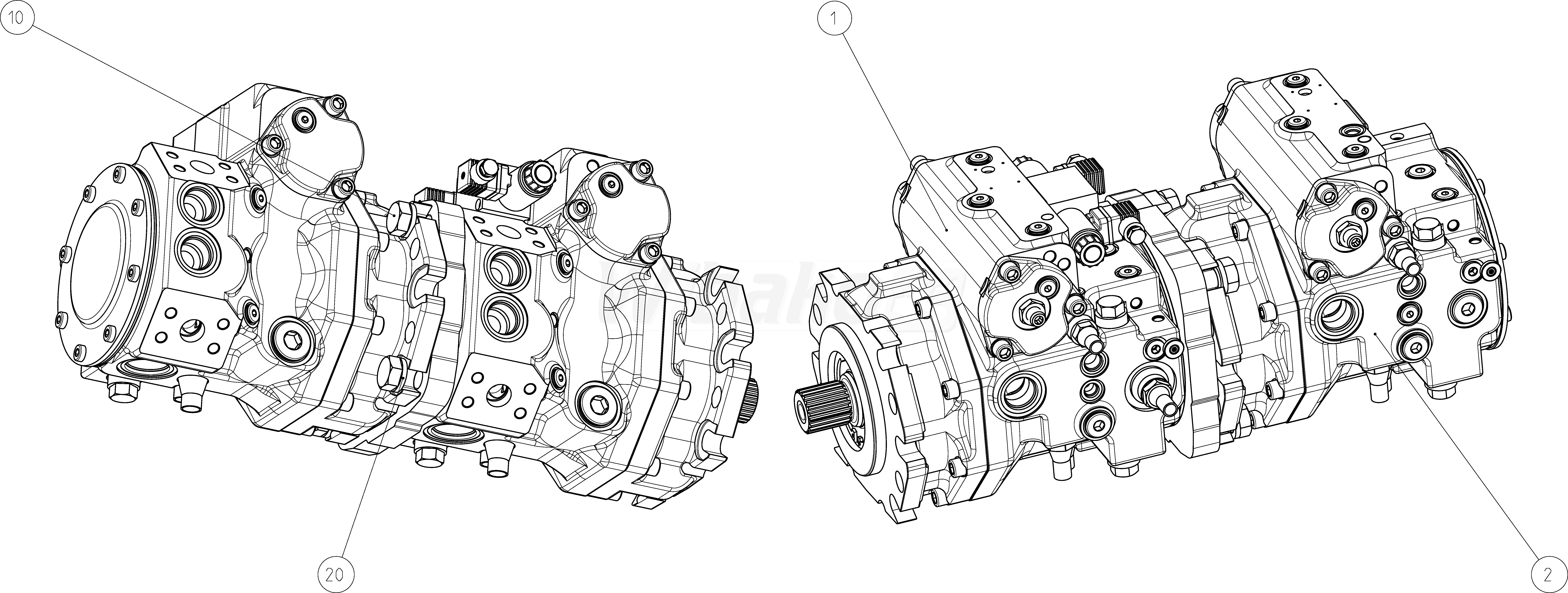 1. Axial piston variable pump A4VG, swashplate design, nominal pressure 450 bar, maximum pressure 500 bar. Pump, closed circuit. Geometric displacement 110 cm3. Automatic control, speed related U = 24 V. Pressure cut-off, with bypass. Fixed setting, hydraulic, mechanical. Series 40. Metric ports according to ISO 6149 with O-ring seal, metric fastening thread according to DIN 13. Direction of rotation: counter-clockwise (viewed on drive shaft).