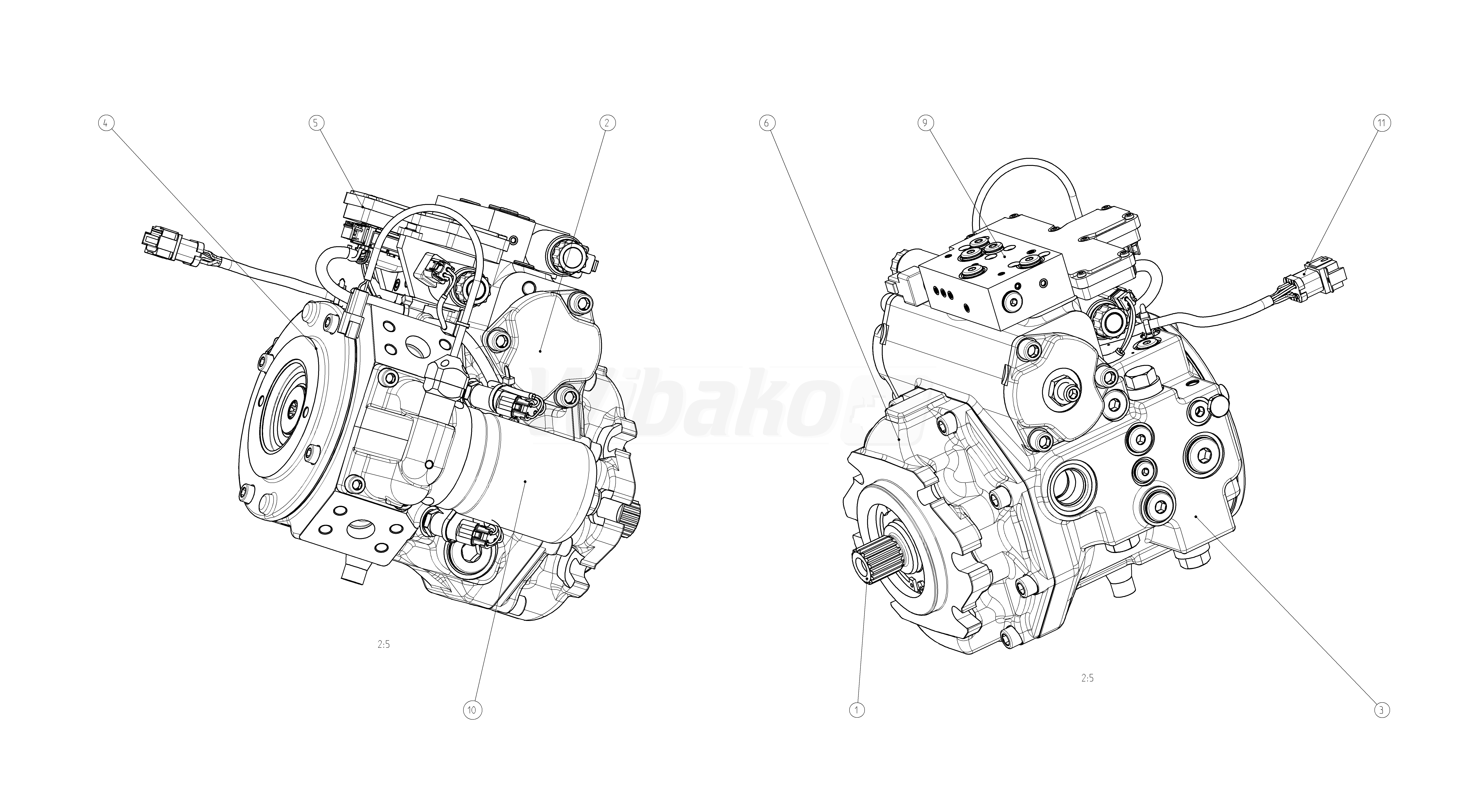 Axial piston variable pump A4VG, swashplate design, nominal pressure 450 bar, maximum pressure 500 bar. Pump, closed circuit. Geometric displacement 085 cm3. Series 40. Metric ports according to ISO 6149 with O-ring seal, metric fastening thread according to DIN 13. Direction of rotation: clockwise (viewed on drive shaft). Sealing material: NBR (nitrile rubber), shaft seal in FKM (fluoroelastomer). Mounting flange SAE J744 127-2/4. SAE working port A and B, on left side (45° left). Standard rotary group, boost pump integrated, standard internal gear pump. Flange SAE J744: diameter- 82-2 (A), mounting- horizontal, code- A2. Hub for splined shaft: diameter- 5/8 in 9T 16/32DP, code- S2. High-pressure relief valve, direct operated, fixed setting, with low-pressure relief valve, fixed setting. Filtration in the boost pump pressure line. Attachment filter with cold start valve and electric contamination indicator – DEUTSCH connector.