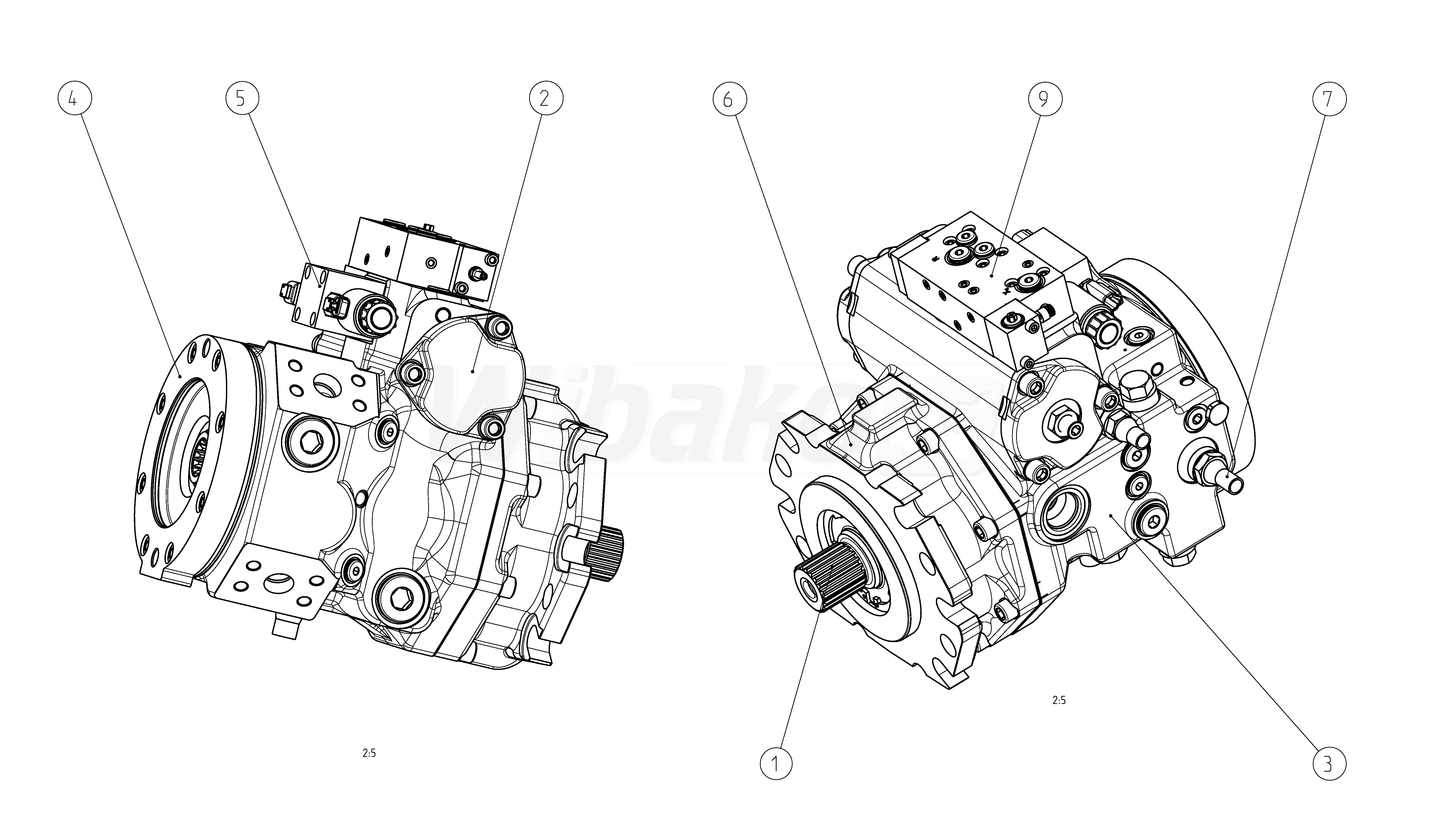 Axial piston variable pump A4VG, swashplate design, nominal pressure 450 bar, maximum pressure 500 bar. Pump, closed circuit. Geometric displacement 110 cm3. Automatic control, speed related U = 12 V. Pressure cut-off, with bypass. Fixed setting, hydraulic, mechanical. DEUTSCH molded connector, 2-pin – without suppressor diode. Without swivel angle sensor. Without additional function. DA control valve, fixed setting and brake inch valve mounted, control with brake fluid based on mineral oil. Series 40. Metric ports according to ISO 6149 with O-ring seal, metric fastening thread according to DIN 13. Direction of rotation: clockwise (viewed on drive shaft). Sealing material: NBR (nitrile rubber), shaft seal in FKM (fluoroelastomer). Mounting flange SAE J744 152-2/4. Splined shaft DIN 5480 W45×2×21×9g. SAE working port A and B, on left side (45° left). Standard rotary group, boost pump integrated, standard internal gear pump. Flange SAE J744: diameter- 127-2 (C), mounting- vertically, code- C1. Hub for splined shaft: diameter- 1 1/4 in 14T 12/24DP, code- S7. High-pressure relief valve, direct operated, fixed setting, with low-pressure relief valve, fixed setting. Filtration in the boost pump suction line. Standard version with installation variants.