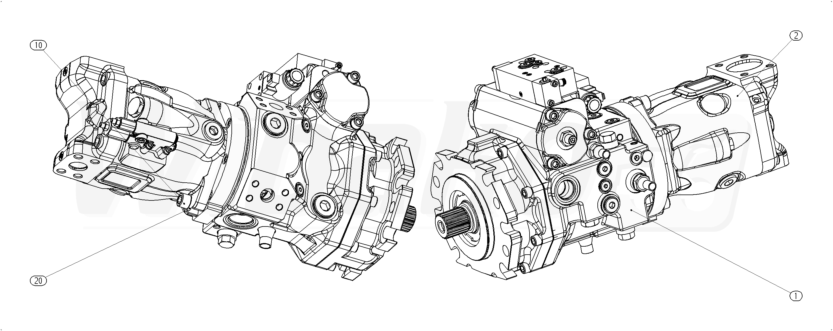 2. Axial piston variable pump A10VO, swashplate design, open circuit, nominal pressure 250 bar, maximum pressure 315 bar. Series 53. Geometric displacement 85 cm3. Pressure controller with flow controller, hydraulic, X-T plugged with flushing function.