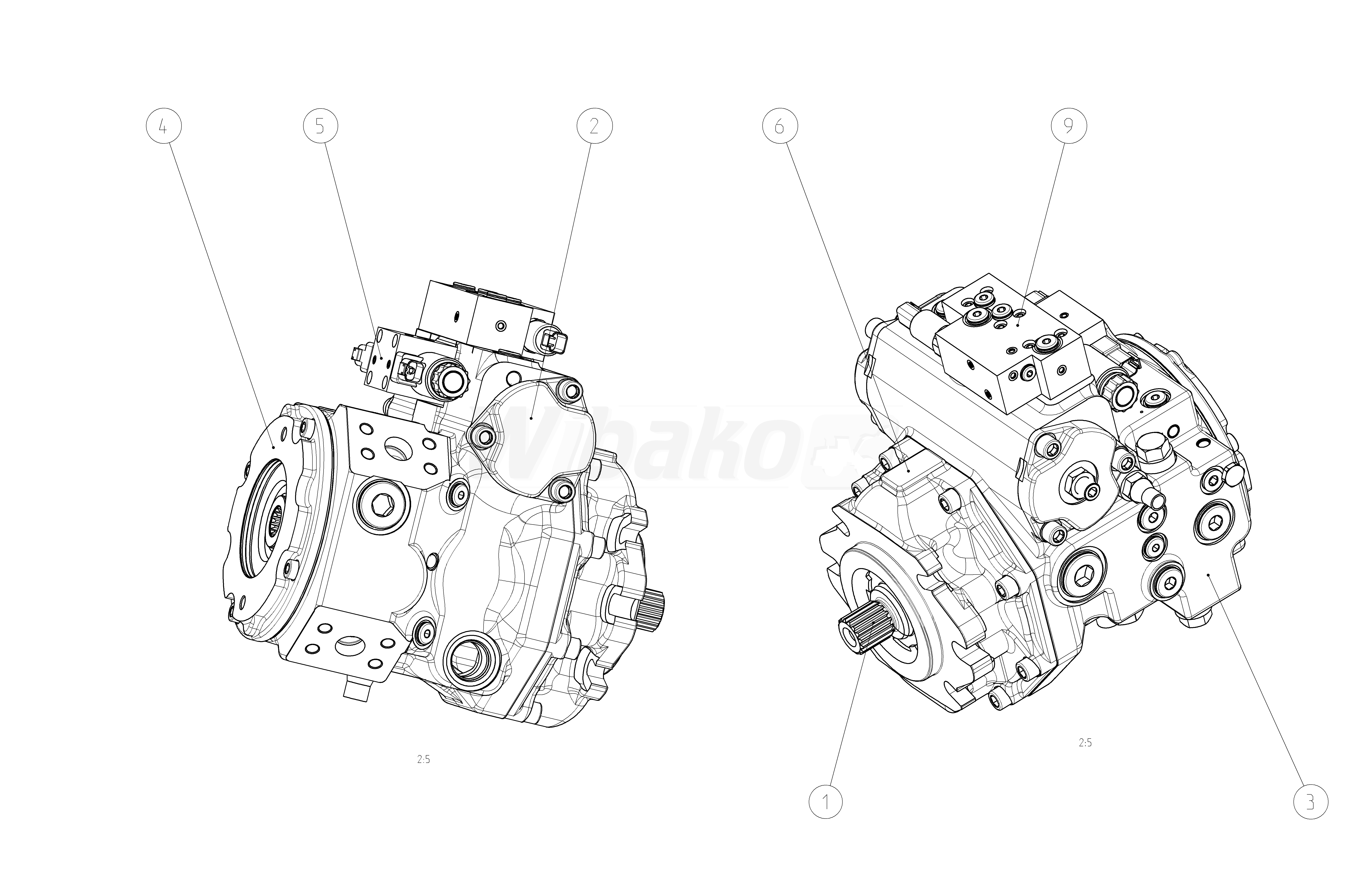 Axial piston variable pump A4VG, swashplate design, nominal pressure 450 bar, maximum pressure 500 bar. Pump, closed circuit. Geometric displacement 085 cm3. Series 40. Metric ports according to ISO 6149 with O-ring seal, metric fastening thread according to DIN 13. Direction of rotation: clockwise (viewed on drive shaft). Sealing material: NBR (nitrile rubber), shaft seal in FKM (fluoroelastomer). Mounting flange SAE J744 127-2/4. SAE working port A and B, on left side (45° left). Standard rotary group, boost pump integrated, standard internal gear pump. Flange SAE J744: diameter- 101-2 (B), mounting- vertical, code- B1. Hub for splined shaft: diameter- 7/8 in 13T 16/32DP, code- S5. High-pressure relief valve, direct operated, fixed setting, with low-pressure relief valve, fixed setting. Filtration in the boost pump suction line.