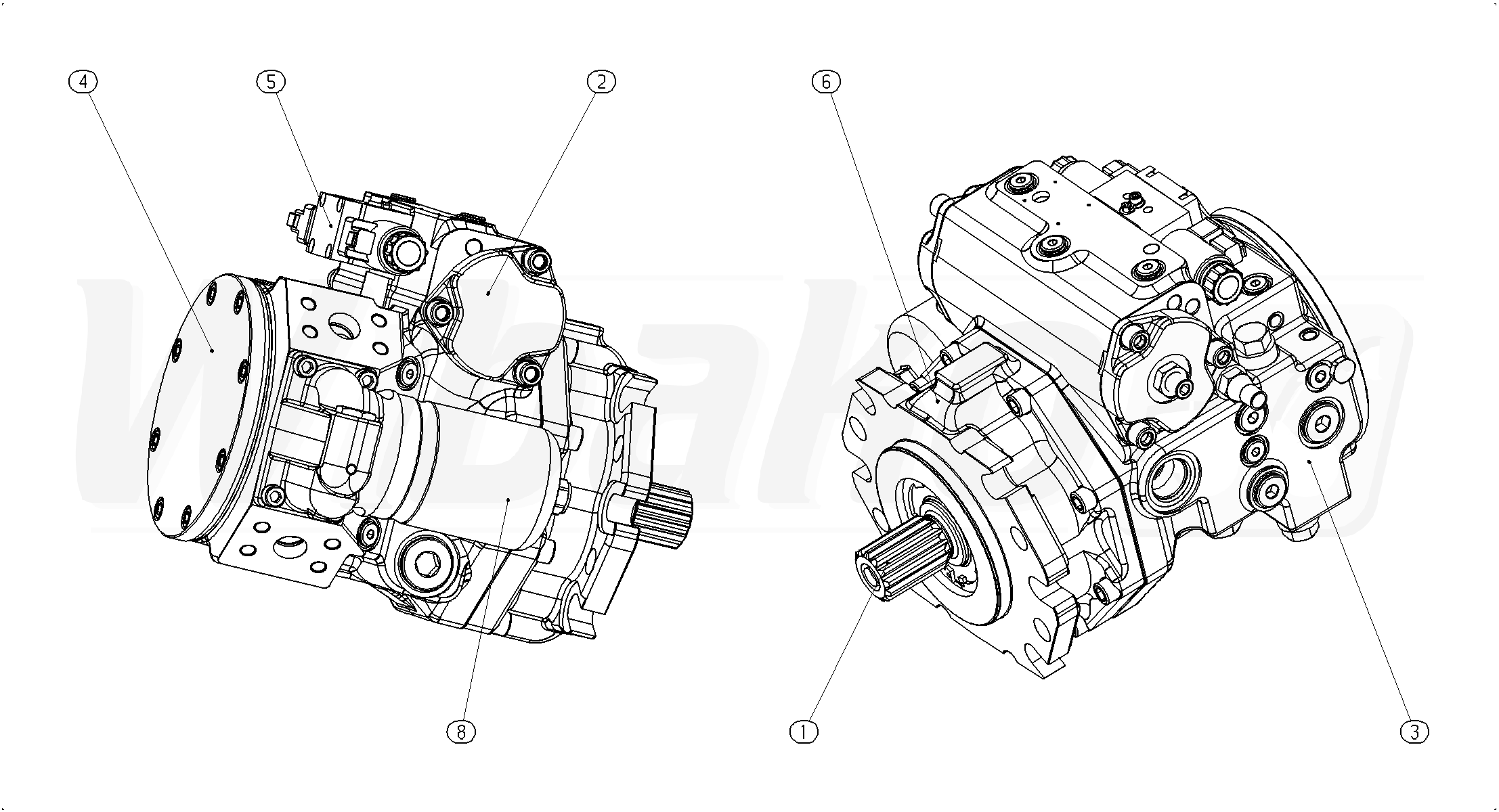 Axial piston variable pump A4VG, swashplate design, nominal pressure 450 bar, maximum pressure 500 bar. Pump, closed circuit. Geometric displacement 110 cm3. Proportional control, electric U = 24 V. Pressure cut-off, with bypass. Fixed setting, hydraulic, mechanical. DEUTSCH molded connector, 2-pin – without suppressor diode. Without swivel angle sensor. Without additional function. Without DA control valve. Series 40. Metric ports according to ISO 6149 with O-ring seal, metric fastening thread according to DIN 13. Direction of rotation: clockwise (viewed on drive shaft). Sealing material: NBR (nitrile rubber), shaft seal in FKM (fluoroelastomer). Mounting flange SAE J744 152-2/4. Splined shaft ANSI B92.1a–1976 1 3/4 in 13T 8/16DP. SAE working port A and B, on left side (45° left). Standard rotary group, boost pump integrated, standard internal gear pump. Without through drive. High-pressure relief valve, direct operated, fixed setting, with low-pressure relief valve, fixed setting. Filtration in the boost pump pressure line. Attachment filter with cold start valve. Special version.