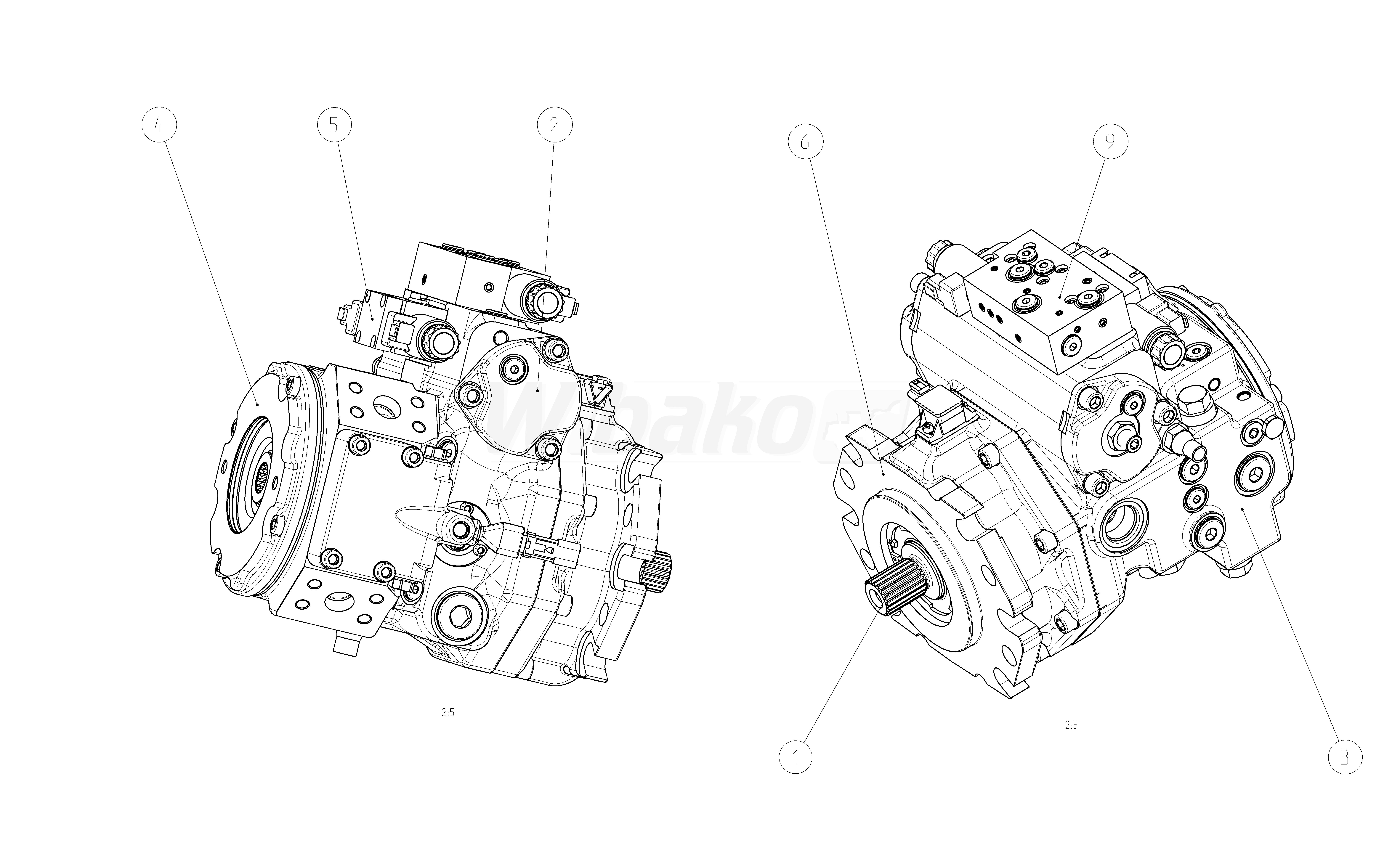 Axial piston variable pump A4VG, swashplate design, nominal pressure 450 bar, maximum pressure 500 bar. Pump, closed circuit. Geometric displacement 110 cm3. Proportional control, electric U = 12 V. Pressure cut-off, with bypass. Fixed setting, hydraulic, mechanical. DEUTSCH molded connector, 2-pin – without suppressor diode. Electric swivel angle sensor (DWS20-1, 3-pin). Neutral valve U = 12 V and ports X3 , X4 for stroking chamber pressure. Without DA control valve. Series 40. Metric ports according to ISO 6149 with O-ring seal, metric fastening thread according to DIN 13. Direction of rotation: clockwise (viewed on drive shaft). Sealing material: NBR (nitrile rubber), shaft seal in FKM (fluoroelastomer). Mounting flange SAE J744 152-2/4. Splined shaft ANSI B92.1a–1976 1 3/8 in 21T 16/32DP. SAE working port A and B, on left side (45° left). Standard rotary group, boost pump integrated, standard internal gear pump. Flange SAE J744: diameter- 101-2 (B), mounting- horizontal, code- B2. Hub for splined shaft: diameter- 7/8 in 13T 16/32DP, code- S5. High-pressure relief valve, direct operated, fixed setting, with low-pressure relief valve, fixed setting.
