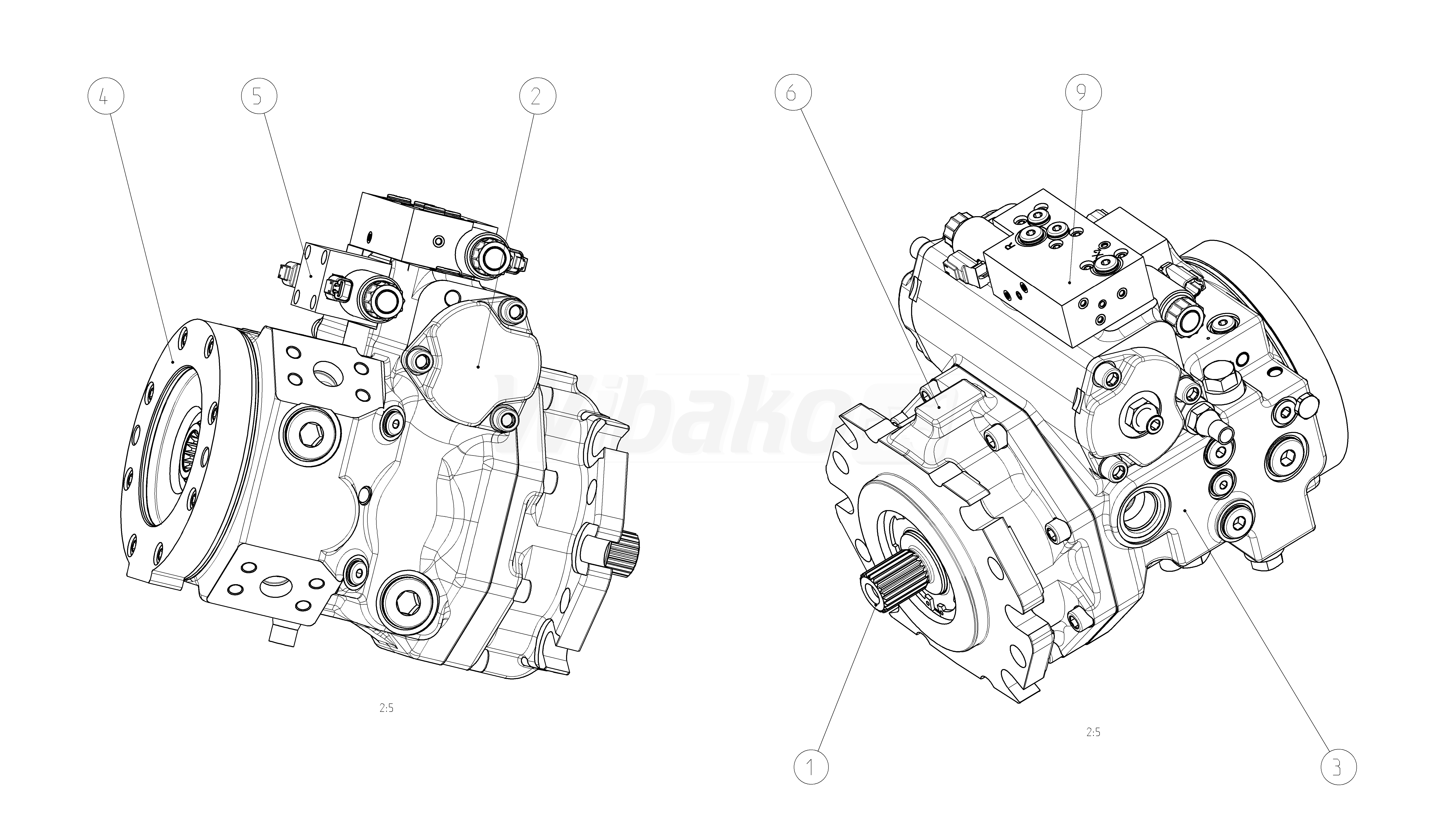 Axial piston variable pump A4VG, swashplate design, nominal pressure 450 bar, maximum pressure 500 bar. Pump, closed circuit. Geometric displacement 110 cm3. Series 40. Metric ports according to ISO 6149 with O-ring seal, metric fastening thread according to DIN 13. Direction of rotation: clockwise (viewed on drive shaft). Sealing material: NBR (nitrile rubber), shaft seal in FKM (fluoroelastomer). Mounting flange SAE J744 152-2/4. Splined shaft ANSI B92.1a–1976 1 3/8 in 21T 16/32DP. SAE working port A and B, on left side (45° left). Standard rotary group, boost pump integrated, standard internal gear pump. Flange SAE J744: diameter- 127-2 (C), mounting- horizontally, code- C2. Hub for splined shaft: diameter- 1 1/4 in 14T 12/24DP, code- S7. High-pressure relief valve, direct operated, fixed setting, with low-pressure relief valve, fixed setting. Filtration in the boost pump suction line.
