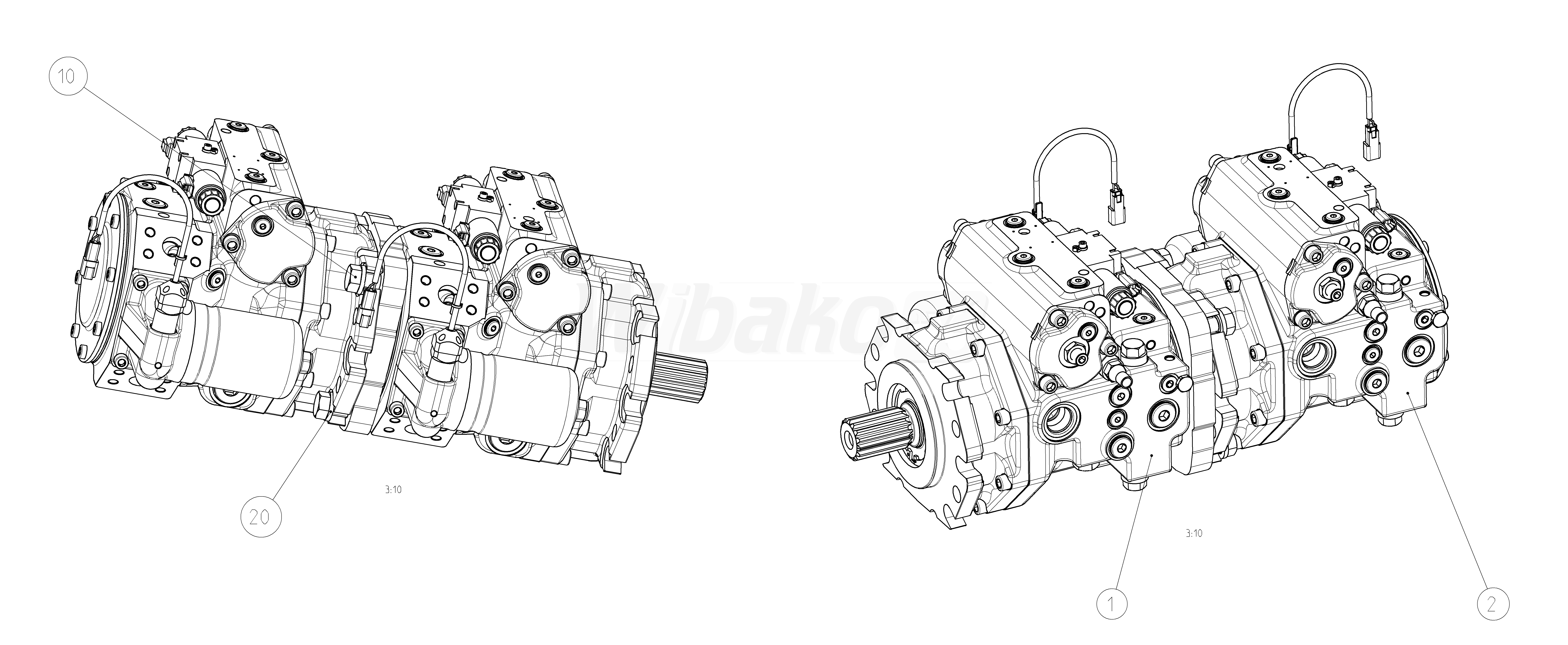 2. Axial piston variable pump A4VG, swashplate design, nominal pressure 450 bar, maximum pressure 500 bar. Pump, closed circuit. Geometric displacement 110 cm3. Proportional control, electric U = 24 V. Series 40. Metric ports according to ISO 6149 with O-ring seal, metric fastening thread according to DIN 13. Direction of rotation: clockwise (viewed on drive shaft).