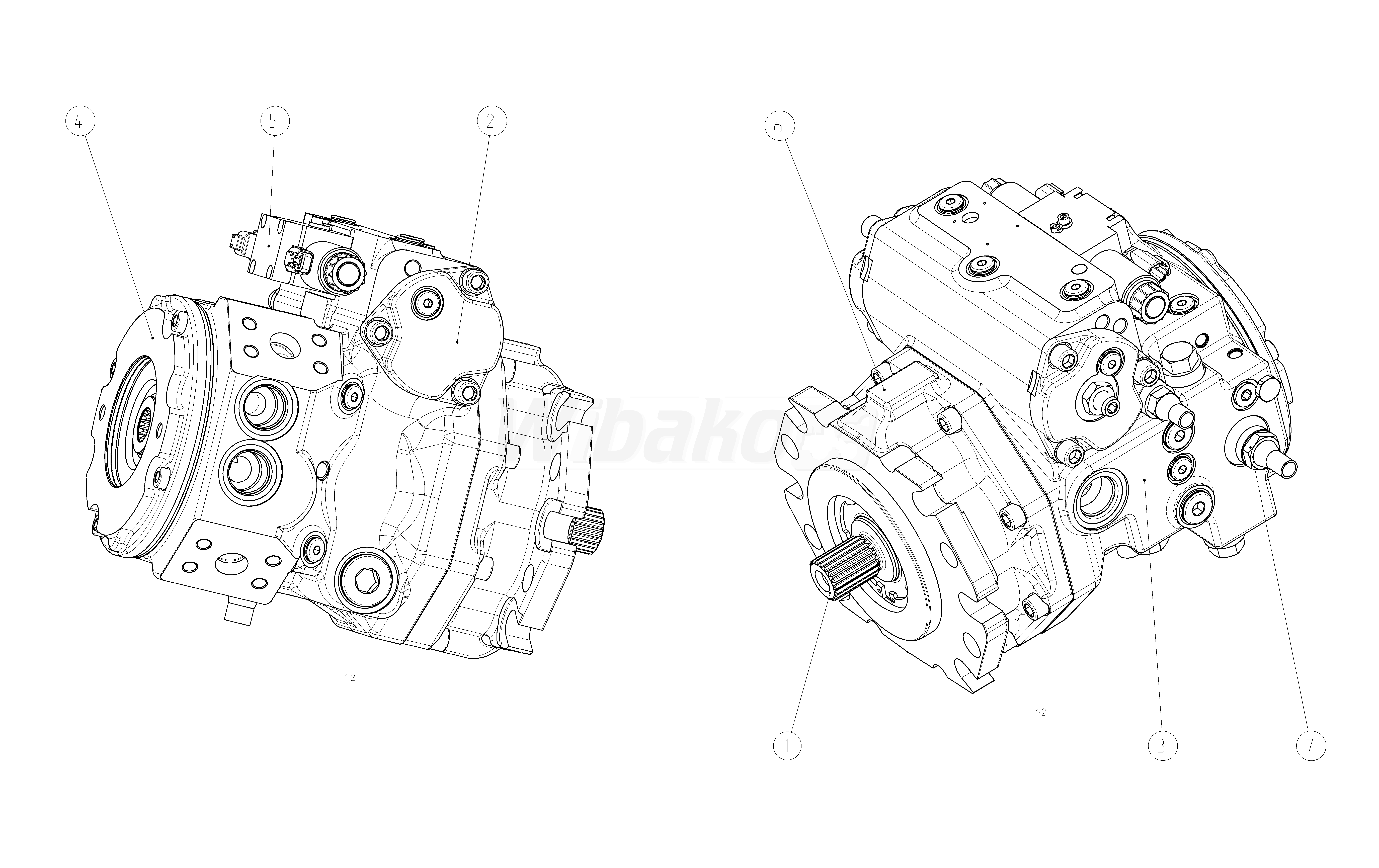 Axial piston variable pump A4VG, swashplate design, nominal pressure 450 bar, maximum pressure 500 bar. Pump, closed circuit. Geometric displacement 110 cm3. Proportional control, electric U = 24 V. Pressure cut-off, with bypass. Fixed setting, hydraulic, mechanical. DEUTSCH molded connector, 2-pin – without suppressor diode. Without swivel angle sensor. Stroking chamber pressure port X3 X4. DA control valve, fixed setting. Series 40. Metric ports according to ISO 6149 with O-ring seal, metric fastening thread according to DIN 13. Direction of rotation: clockwise (viewed on drive shaft). Sealing material: NBR (nitrile rubber), shaft seal in FKM (fluoroelastomer). Mounting flange SAE J744 152-2/4. Splined shaft ANSI B92.1a–1976 1 3/8 in 21T 16/32DP. SAE working port A and B, on left side (45° left). Standard rotary group, boost pump integrated, standard internal gear pump. Flange SAE J744: diameter- 101-2 (B), mounting- horizontal, code- B2. Hub for splined shaft: diameter- 7/8 in 13T 16/32DP, code- S5. High-pressure relief valve, direct operated, fixed setting, with low-pressure relief valve, fixed setting. Filtration in the boost pump pressure line. Ports for external boost circuit filtration (Fe and Fa).