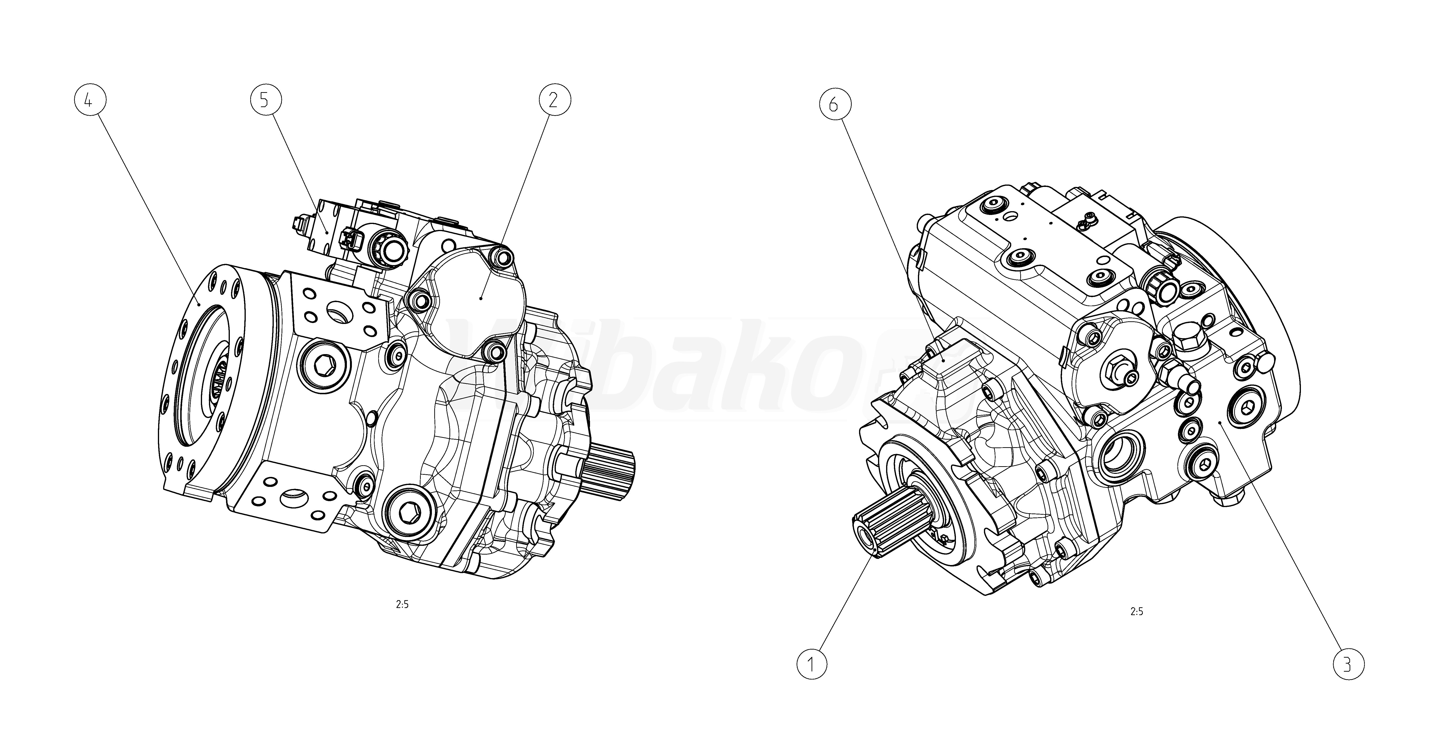 Axial piston variable pump A4VG, swashplate design, nominal pressure 450 bar, maximum pressure 500 bar. Pump, closed circuit. Geometric displacement 110 cm3. Proportional control, electric U = 12 V. Series 40. Metric ports according to ISO 6149 with O-ring seal, metric fastening thread according to DIN 13. Direction of rotation: counter-clockwise (viewed on drive shaft). Sealing material: NBR (nitrile rubber), shaft seal in FKM (fluoroelastomer). Mounting flange SAE J744 127-2/4. Splined shaft ANSI B92.1a–1976 1 3/4 in 13T 8/16DP. SAE working port A and B, on left side (45° left). Standard rotary group, boost pump integrated, standard internal gear pump. Special version.