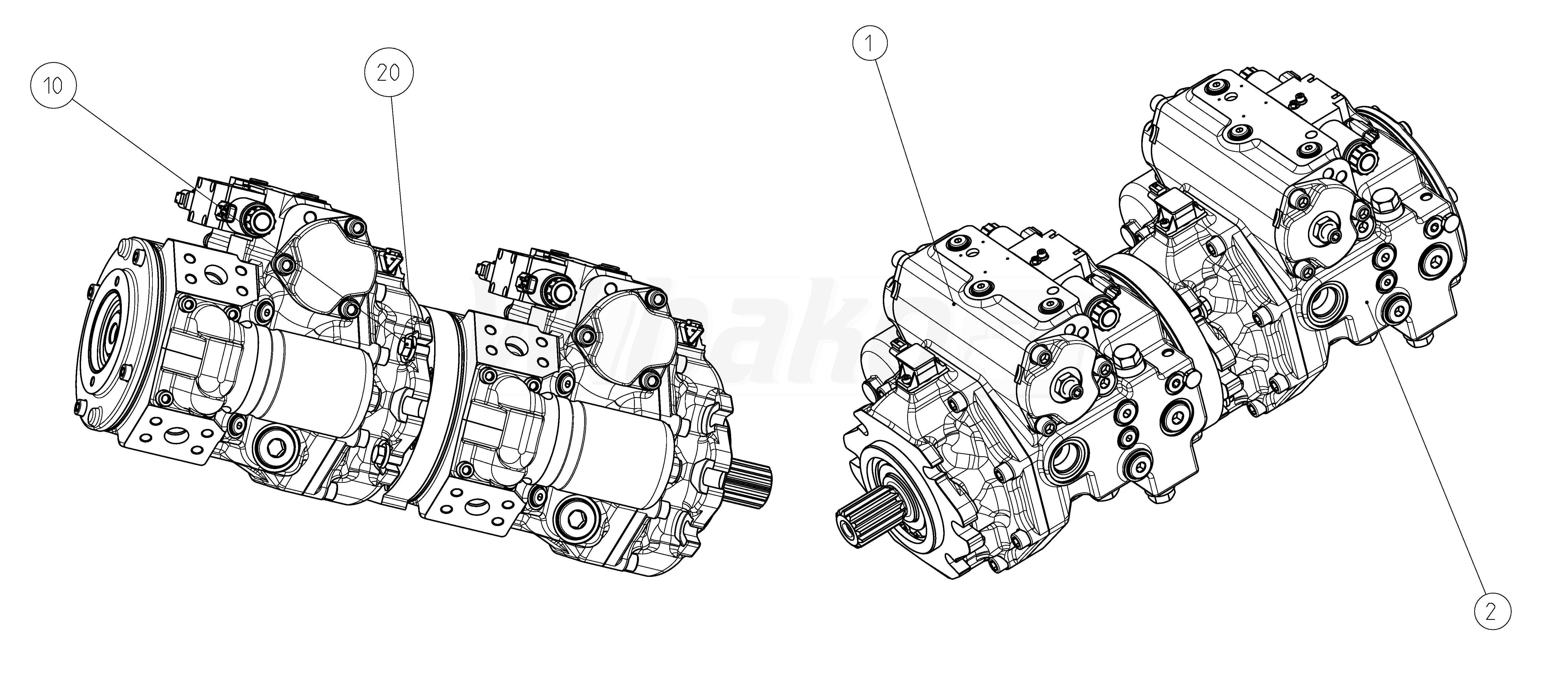 2. Axial piston variable pump A4VG, swashplate design, nominal pressure 450 bar, maximum pressure 500 bar. Pump, closed circuit. Geometric displacement 110 cm3. Proportional control, electric U = 12 V. Series 40. Metric ports according to ISO 6149 with O-ring seal, metric fastening thread according to DIN 13. Direction of rotation: counter-clockwise (viewed on drive shaft).