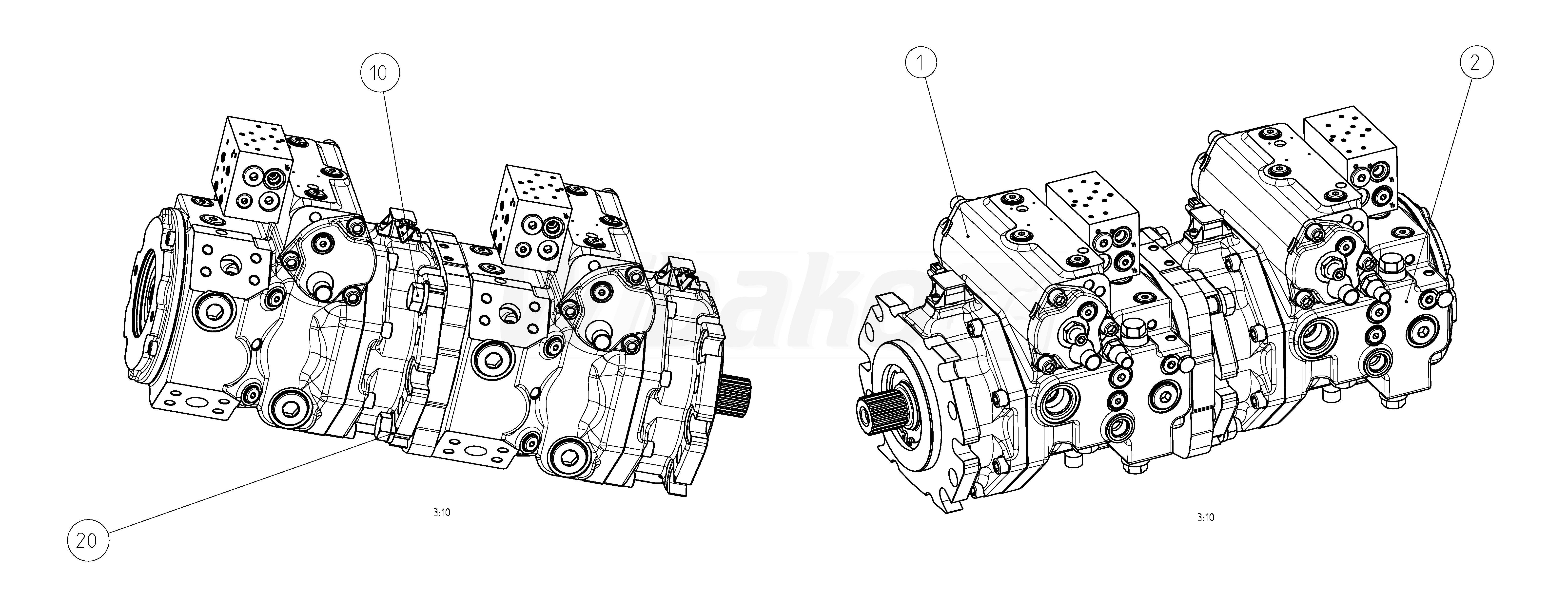 2. Axial piston variable pump A4VG, swashplate design, nominal pressure 450 bar, maximum pressure 500 bar. Pump, closed circuit. Geometric displacement 110 cm3. Neutral valve U = 12 V and mechanical stroke limiter and ports X3 X4. Series 40. Direction of rotation: counter-clockwise (viewed on drive shaft).