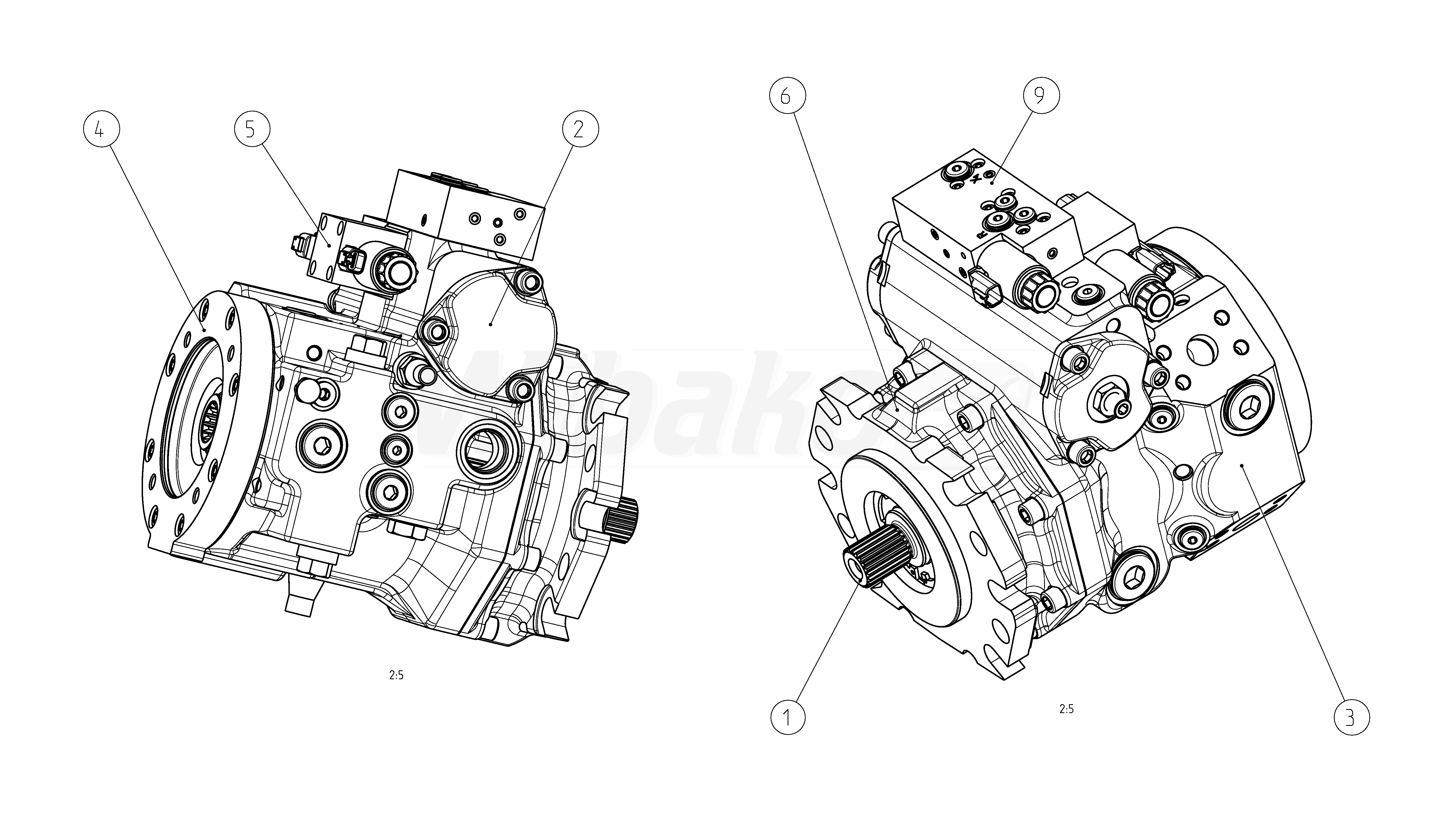 Axial piston variable pump A4VG, swashplate design, nominal pressure 450 bar, maximum pressure 500 bar. Pump, closed circuit. Geometric displacement 085 cm3. Series 40. Metric ports according to ISO 6149 with O-ring seal, metric fastening thread according to DIN 13. Direction of rotation: clockwise (viewed on drive shaft). Sealing material: NBR (nitrile rubber), shaft seal in FKM (fluoroelastomer). Mounting flange SAE J744 152-2/4. Splined shaft ANSI B92.1a–1976 1 3/8 in 21T 16/32DP. SAE working port A and B, on right side (45° right). Standard rotary group, boost pump integrated, standard internal gear pump. Flange SAE J744: diameter- 127-4 (C), mounting- squarely, code- C4. Hub for splined shaft: diameter- 1 1/4 in 14T 12/24DP, code- S7. High-pressure relief valve, direct operated, fixed setting, with low-pressure relief valve, fixed setting. Filtration in the boost pump suction line.