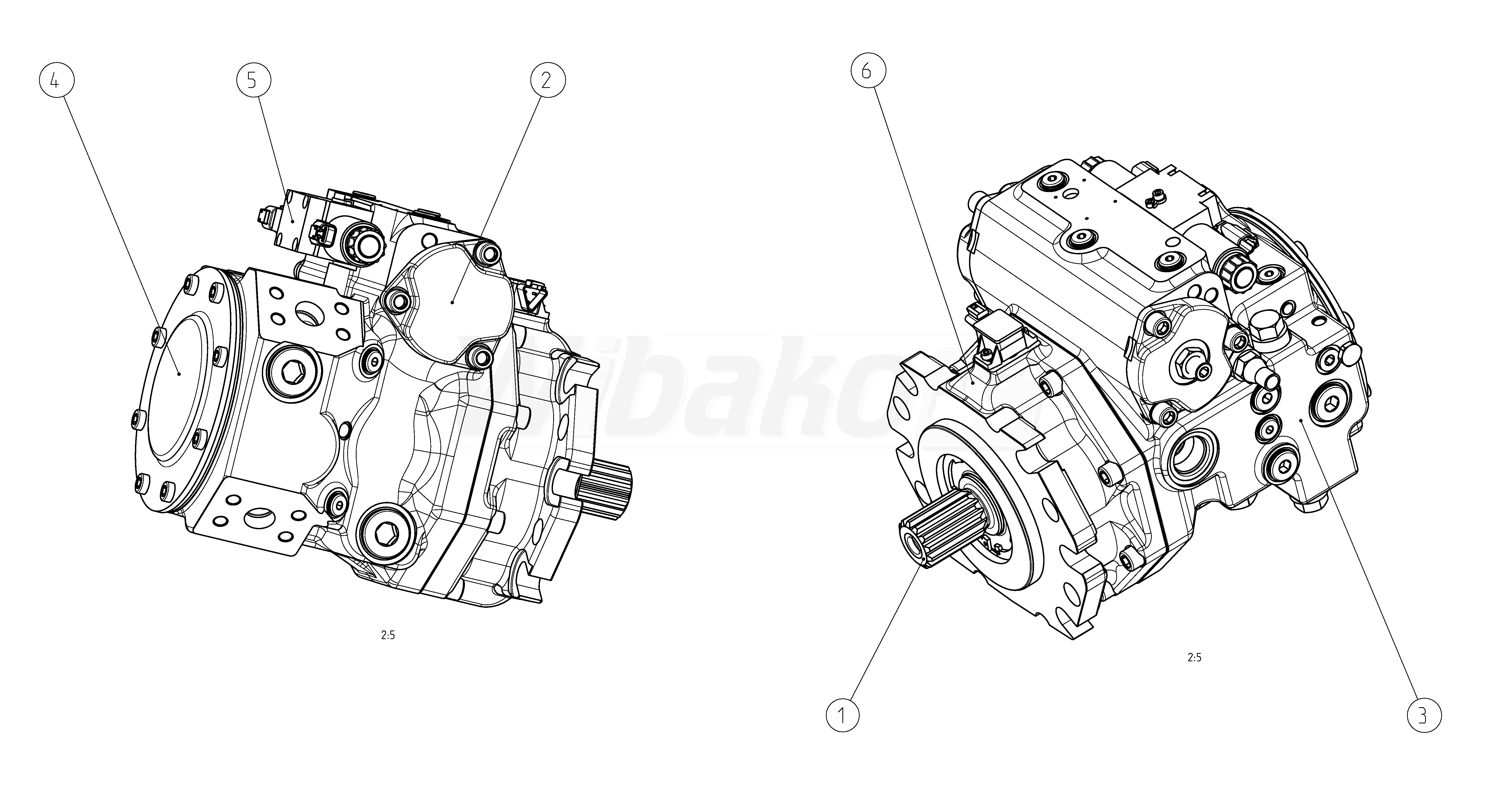 Axial piston variable pump A4VG, swashplate design, nominal pressure 450 bar, maximum pressure 500 bar. Pump, closed circuit. Geometric displacement 110 cm3. Proportional control, electric U = 24 V. Mechanical stroke limiter and stroking chamber pressure port X3 X4. Series 40. Metric ports according to ISO 6149 with O-ring seal, metric fastening thread according to DIN 13. Direction of rotation: clockwise (viewed on drive shaft). Sealing material: NBR (nitrile rubber), shaft seal in FKM (fluoroelastomer). Mounting flange SAE J744 152-2/4. Splined shaft ANSI B92.1a–1976 1 3/4 in 13T 8/16DP. SAE working port A and B, on left side (45° left). Standard rotary group, boost pump integrated, standard internal gear pump. Without through drive. High-pressure relief valve, direct operated, fixed setting, with low-pressure relief valve, fixed setting. Filtration in the boost pump suction line.