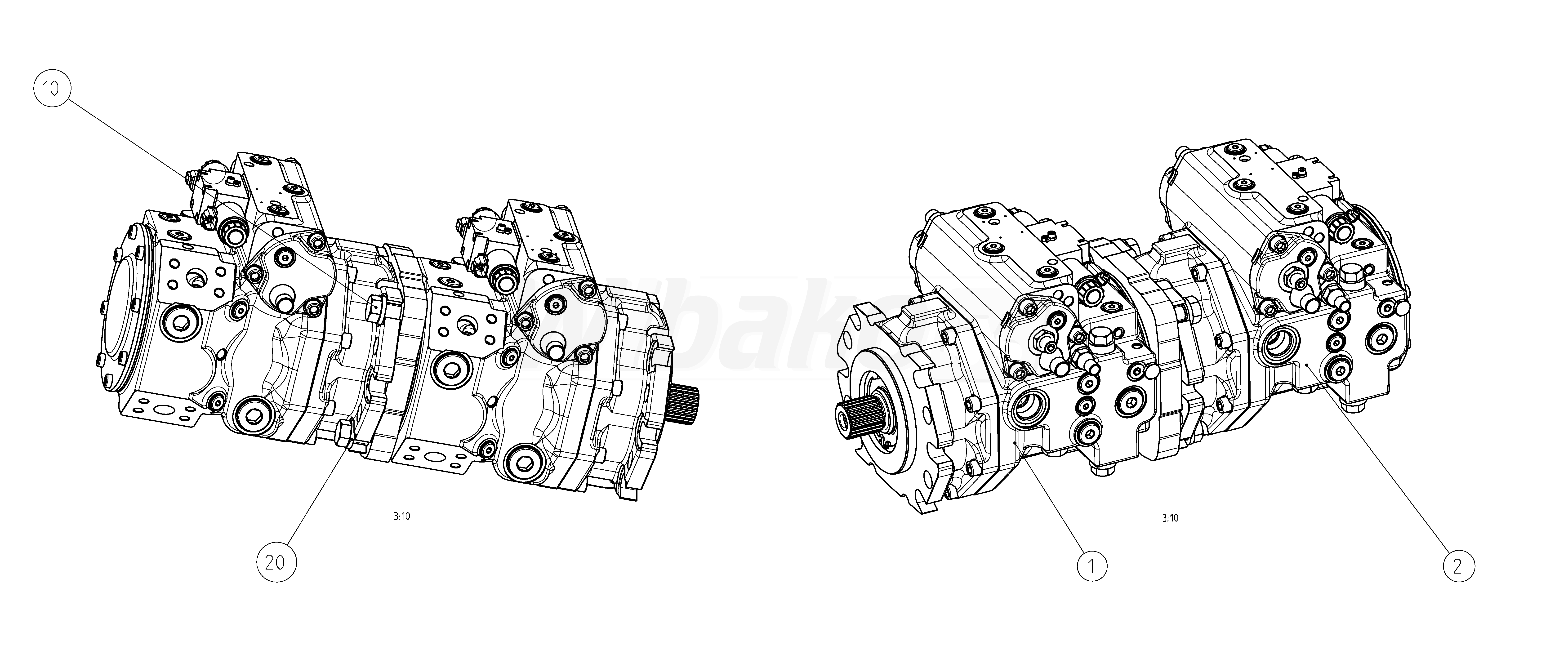 2. Axial piston variable pump A4VG, swashplate design, nominal pressure 450 bar, maximum pressure 500 bar. Pump, closed circuit. Geometric displacement 110 cm3. Proportional control, electric U = 24 V. Series 40. Metric ports according to ISO 6149 with O-ring seal, metric fastening thread according to DIN 13. Direction of rotation: clockwise (viewed on drive shaft).
