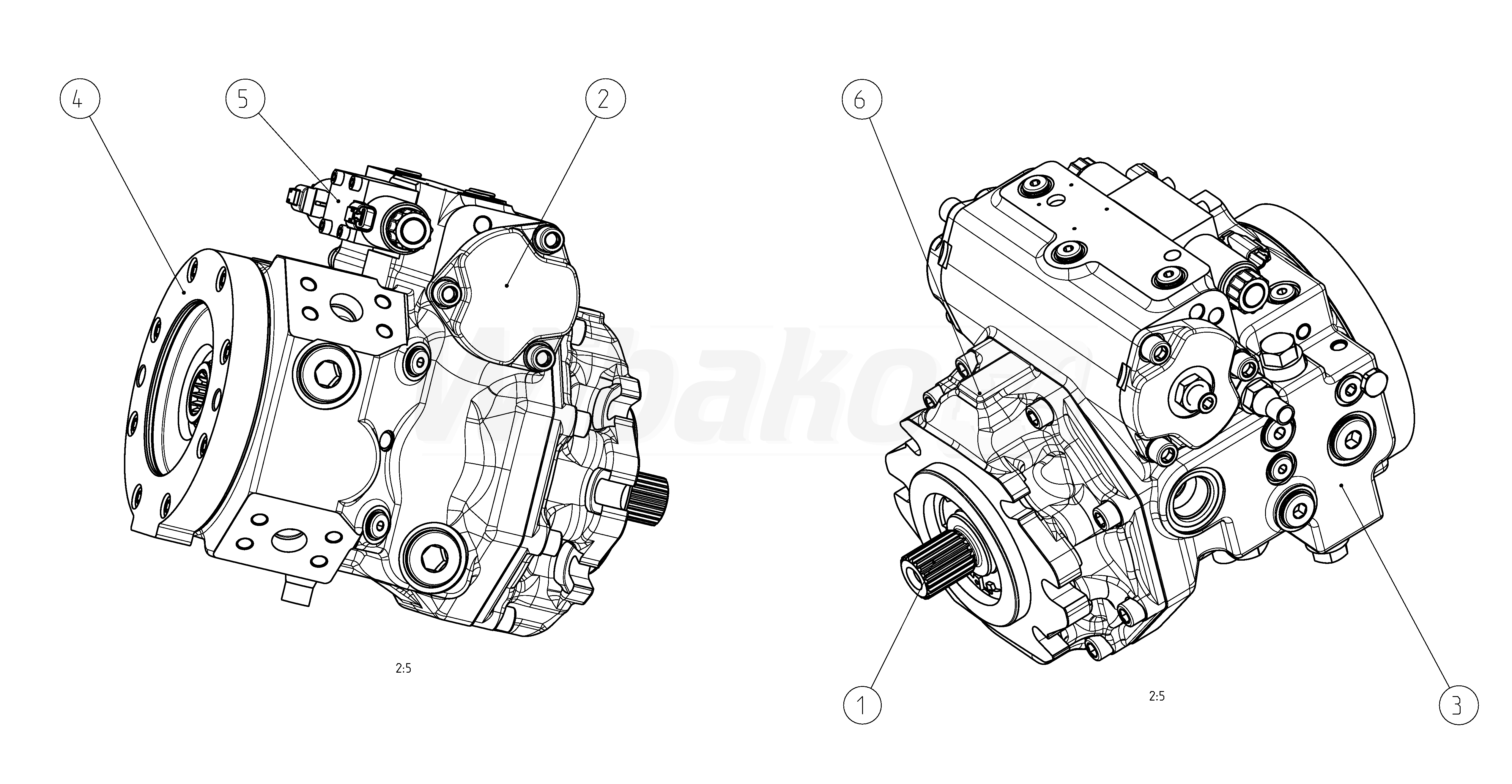 Axial piston variable pump A4VG, swashplate design, nominal pressure 450 bar, maximum pressure 500 bar. Pump, closed circuit. Geometric displacement 085 cm3. Pressure cut-off, with bypass. Fixed setting, hydraulic, mechanical. DEUTSCH molded connector, 2-pin – without suppressor diode. Without swivel angle sensor. Without additional function. Without DA control valve. Series 40. Metric ports according to ISO 6149 with O-ring seal, metric fastening thread according to DIN 13. Direction of rotation: clockwise (viewed on drive shaft). Sealing material: NBR (nitrile rubber), shaft seal in FKM (fluoroelastomer). Mounting flange SAE J744 127-2/4. Splined shaft ANSI B92.1a–1976 1 3/8 in 21T 16/32DP. SAE working port A and B, on left side (45° left). Standard rotary group, boost pump integrated, standard internal gear pump. Flange SAE J744: diameter- 127-2 (C), mounting- horizontally, code- C2. Hub for splined shaft: diameter- 1 1/4 in 14T 12/24DP, code- S7. High-pressure relief valve, direct operated, fixed setting, with low-pressure relief valve, fixed setting. Filtration in the boost pump suction line.