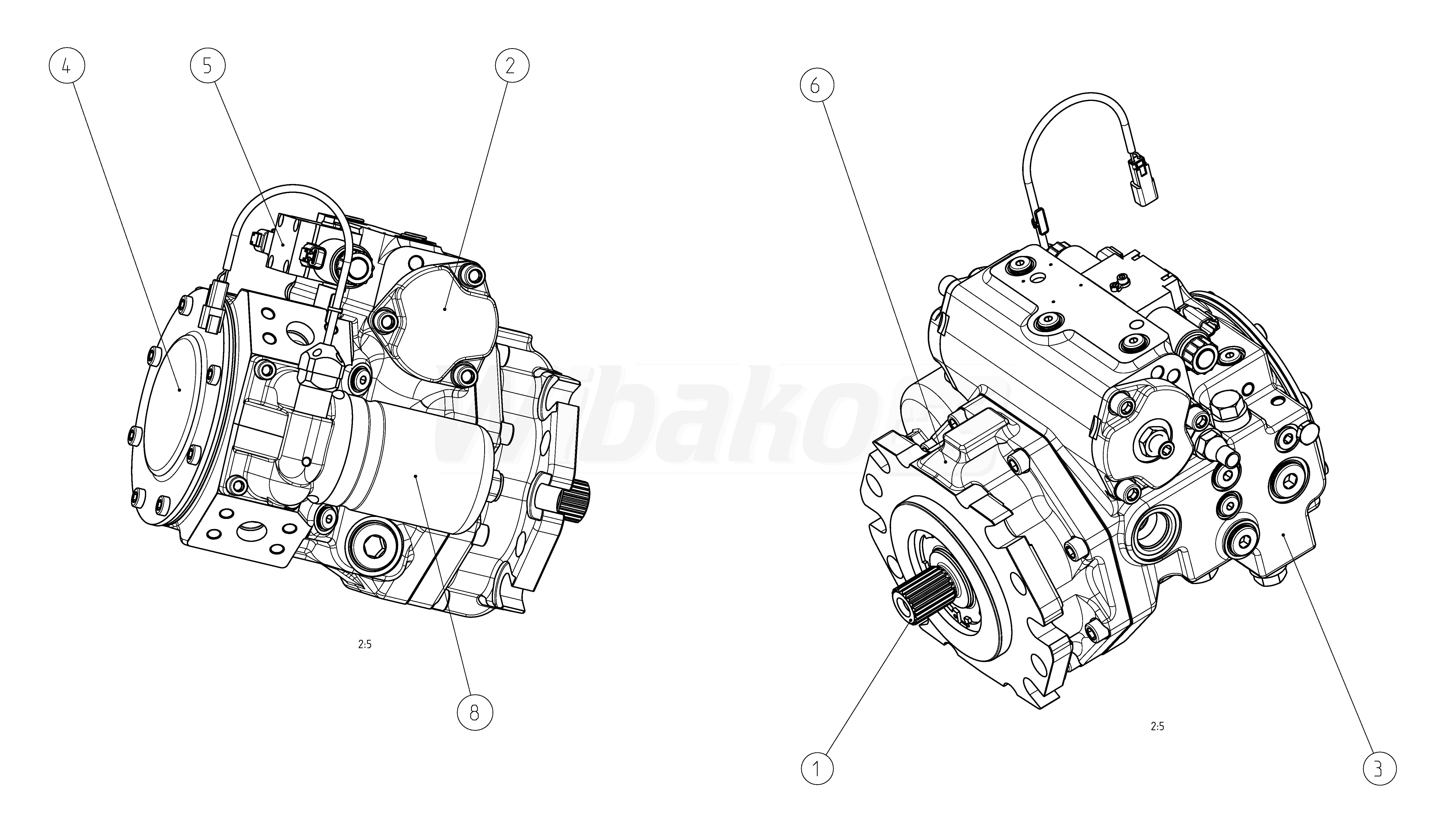 Axial piston variable pump A4VG, swashplate design, nominal pressure 450 bar, maximum pressure 500 bar. Pump, closed circuit. Geometric displacement 110 cm3. Proportional control, electric U = 24 V. Pressure cut-off, with bypass. Fixed setting, hydraulic, mechanical. DEUTSCH molded connector, 2-pin – without suppressor diode. Without swivel angle sensor. Without additional function. Without DA control valve. Series 40. Metric ports according to ISO 6149 with O-ring seal, metric fastening thread according to DIN 13. Direction of rotation: clockwise (viewed on drive shaft). Sealing material: NBR (nitrile rubber), shaft seal in FKM (fluoroelastomer). Mounting flange SAE J744 152-2/4. Splined shaft ANSI B92.1a–1976 1 3/8 in 21T 16/32DP. SAE working port A and B, on left side (45° left). Standard rotary group, boost pump integrated, standard internal gear pump. Without through drive. High-pressure relief valve, direct operated, fixed setting, with low-pressure relief valve, fixed setting. Filtration in the boost pump pressure line. Attachment filter with cold start valve and electric contamination indicator – DEUTSCH connector.