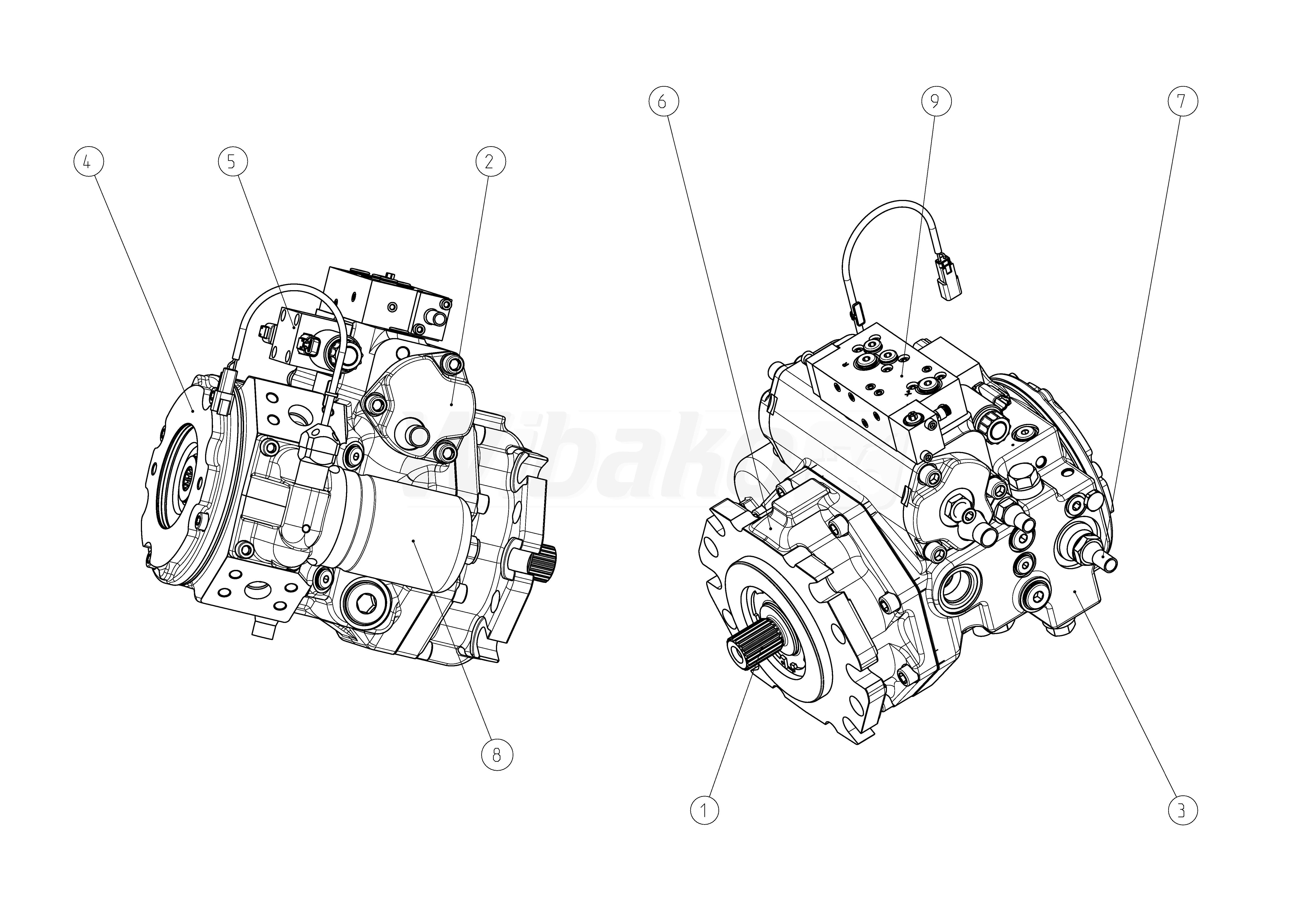 Axial piston variable pump A4VG, swashplate design, nominal pressure 450 bar, maximum pressure 500 bar. Pump, closed circuit. Geometric displacement 110 cm3. Automatic control, speed related U = 24 V. Pressure cut-off, with bypass. Fixed setting, hydraulic, mechanical. DEUTSCH molded connector, 2-pin – without suppressor diode. Without swivel angle sensor. Mechanical stroke limiter, externally adjustable. DA control valve, fixed setting and brake inch valve mounted, control with brake fluid based on mineral oil. Series 40. Metric ports according to ISO 6149 with O-ring seal, metric fastening thread according to DIN 13. Direction of rotation: clockwise (viewed on drive shaft). Sealing material: NBR (nitrile rubber), shaft seal in FKM (fluoroelastomer). Mounting flange SAE J744 152-2/4. Splined shaft ANSI B92.1a–1976 1 3/8 in 21T 16/32DP. SAE working port A and B, on left side (45° left). Standard rotary group, boost pump integrated, standard internal gear pump. Flange SAE J744: diameter- 101-2 (B), mounting- horizontal, code- B2. Hub for splined shaft: diameter- 7/8 in 13T 16/32DP, code- S4. High-pressure relief valve, direct operated, fixed setting, with low-pressure relief valve, fixed setting. Filtration in the boost pump pressure line. Attachment filter with cold start valve and electric contamination indicator – DEUTSCH connector.