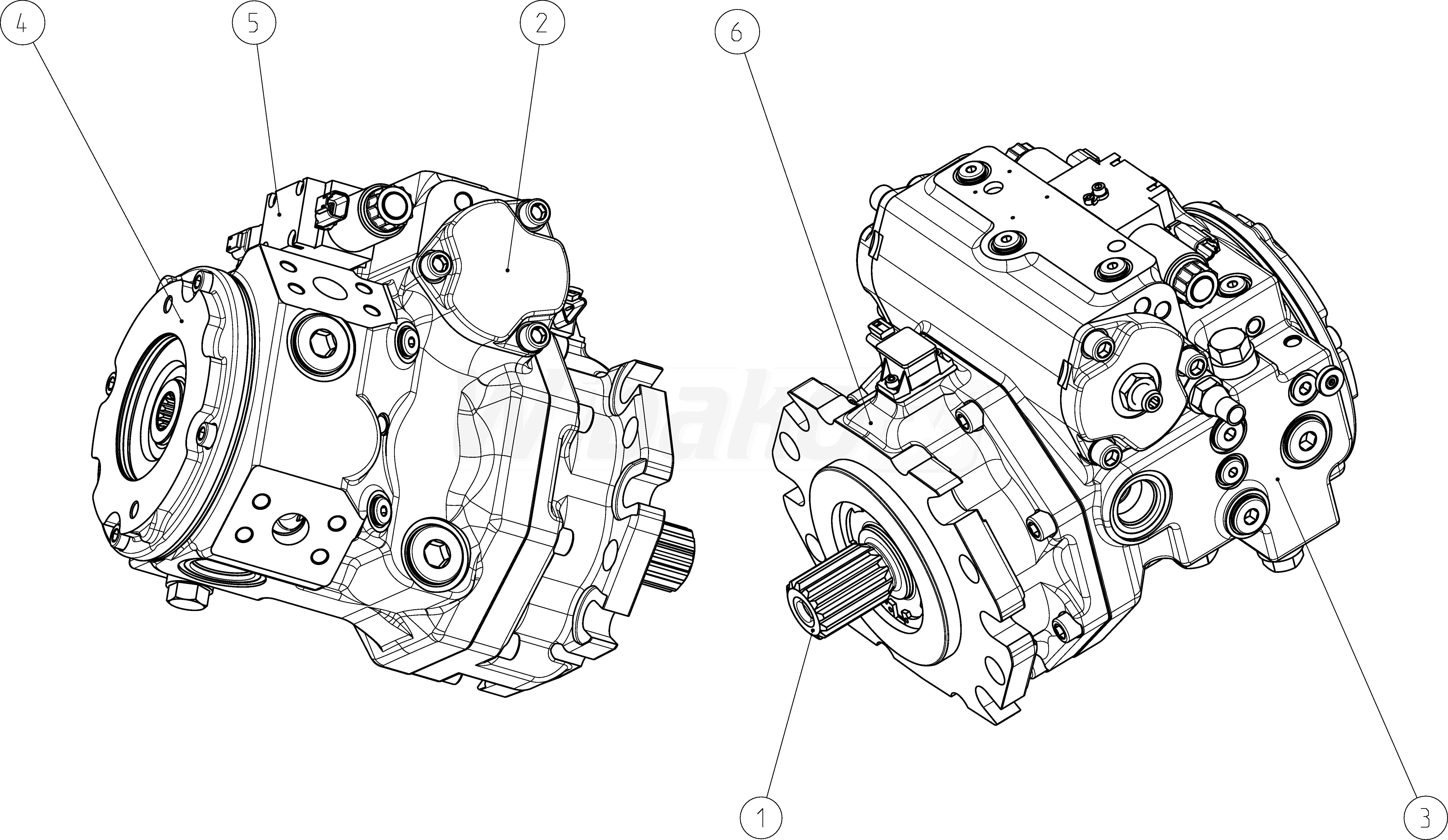 Axial piston variable pump A4VG, swashplate design, nominal pressure 450 bar, maximum pressure 500 bar. Pump, closed circuit. Geometric displacement 110 cm3. Proportional control, electric U = 24 V. Mechanical stroke limiter and stroking chamber pressure port X3 X4. Series 40. Metric ports according to ISO 6149 with O-ring seal, metric fastening thread according to DIN 13. Direction of rotation: counter-clockwise (viewed on drive shaft). Sealing material: NBR (nitrile rubber), shaft seal in FKM (fluoroelastomer). Mounting flange SAE J744 152-2/4. Splined shaft ANSI B92.1a–1976 1 3/4 in 13T 8/16DP. SAE working port A and B, on left side (45° left). Standard rotary group, boost pump integrated, standard internal gear pump. Flange SAE J744: diameter- 101-2 (B), mounting- vertical, code- B1. Hub for splined shaft: diameter- 7/8 in 13T 16/32DP, code- S5.