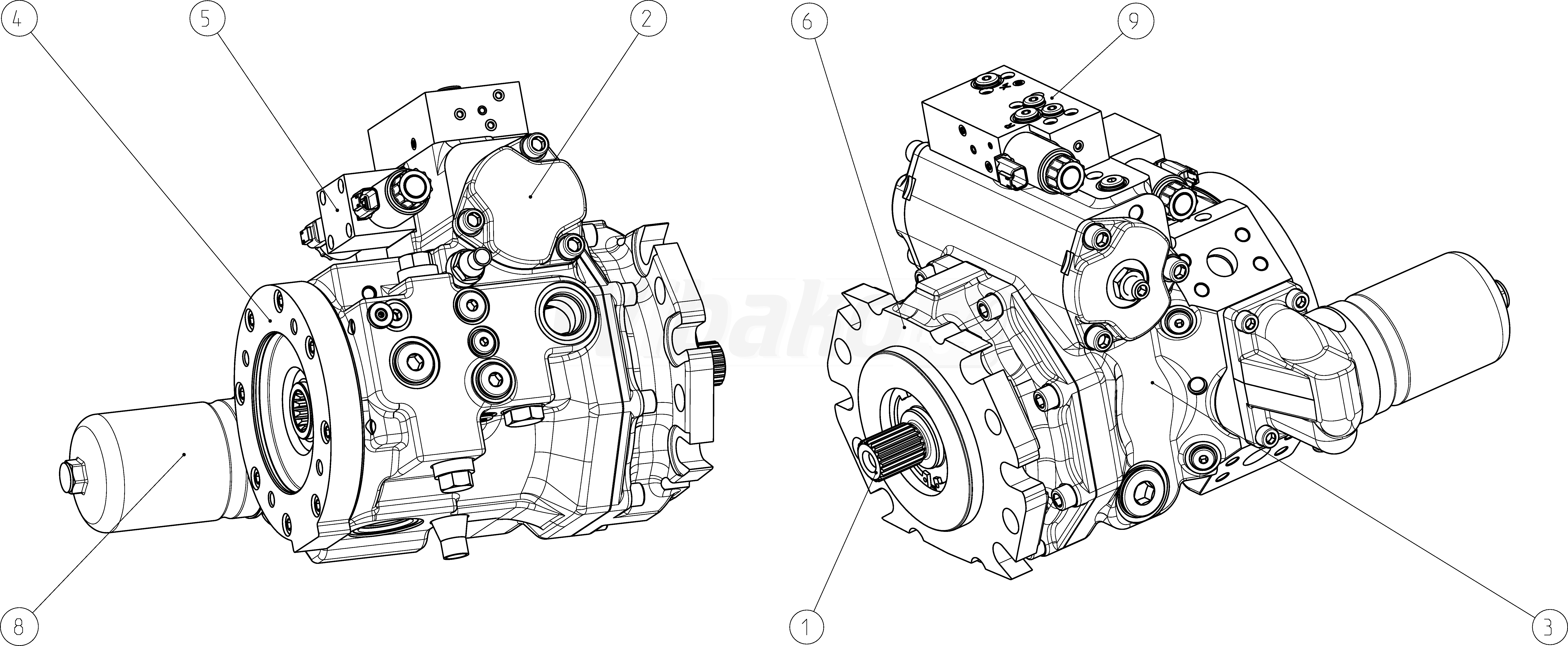 Axial piston variable pump A4VG, swashplate design, nominal pressure 450 bar, maximum pressure 500 bar. Pump, closed circuit. Geometric displacement 085 cm3. Series 40. Metric ports according to ISO 6149 with O-ring seal, metric fastening thread according to DIN 13. Direction of rotation: clockwise (viewed on drive shaft). Sealing material: NBR (nitrile rubber), shaft seal in FKM (fluoroelastomer). Mounting flange SAE J744 152-2/4. Splined shaft ANSI B92.1a–1976 1 3/8 in 21T 16/32DP. SAE working port A and B, on right side (45° right). Standard rotary group, boost pump integrated, standard internal gear pump. Flange SAE J744: diameter- 127-4 (C), mounting- squarely, code- C4. Hub for splined shaft: diameter- 1 1/4 in 14T 12/24DP, code- S7. High-pressure relief valve, direct operated, fixed setting, with low-pressure relief valve, fixed setting. Filtration in the boost pump pressure line. Attachment filter with cold start valve. Special version.
