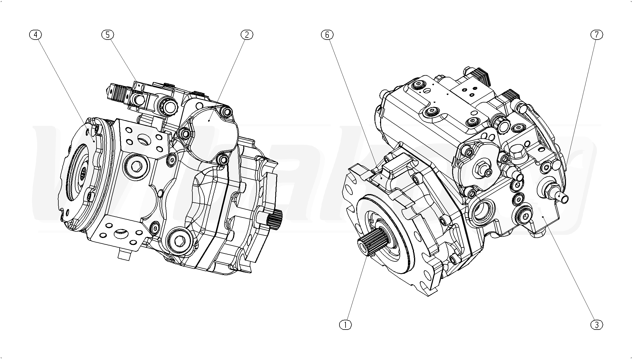 Axial piston variable pump A4VG, swashplate design, nominal pressure 450 bar, maximum pressure 500 bar. Pump, closed circuit. Geometric displacement 110 cm3. Automatic control, speed related U = 24 V. Pressure cut-off, with bypass. Fixed setting, hydraulic, mechanical. Series 40. Metric ports according to ISO 6149 with O-ring seal, metric fastening thread according to DIN 13. Direction of rotation: clockwise (viewed on drive shaft). Sealing material: NBR (nitrile rubber), shaft seal in FKM (fluoroelastomer). Mounting flange SAE J744 152-2/4. Splined shaft ANSI B92.1a–1976 1 3/8 in 21T 16/32DP. SAE working port A and B, on left side (45° left). Standard rotary group, boost pump integrated, standard internal gear pump. Flange SAE J744: diameter- 101-2 (B), mounting- verical, code- B1. Hub for splined shaft: diameter- 7/8 in 13T 16/32DP, code- S4. High-pressure relief valve, direct operated, fixed setting, with low-pressure relief valve, fixed setting. Filtration in the boost pump suction line. Standard version with installation variants.