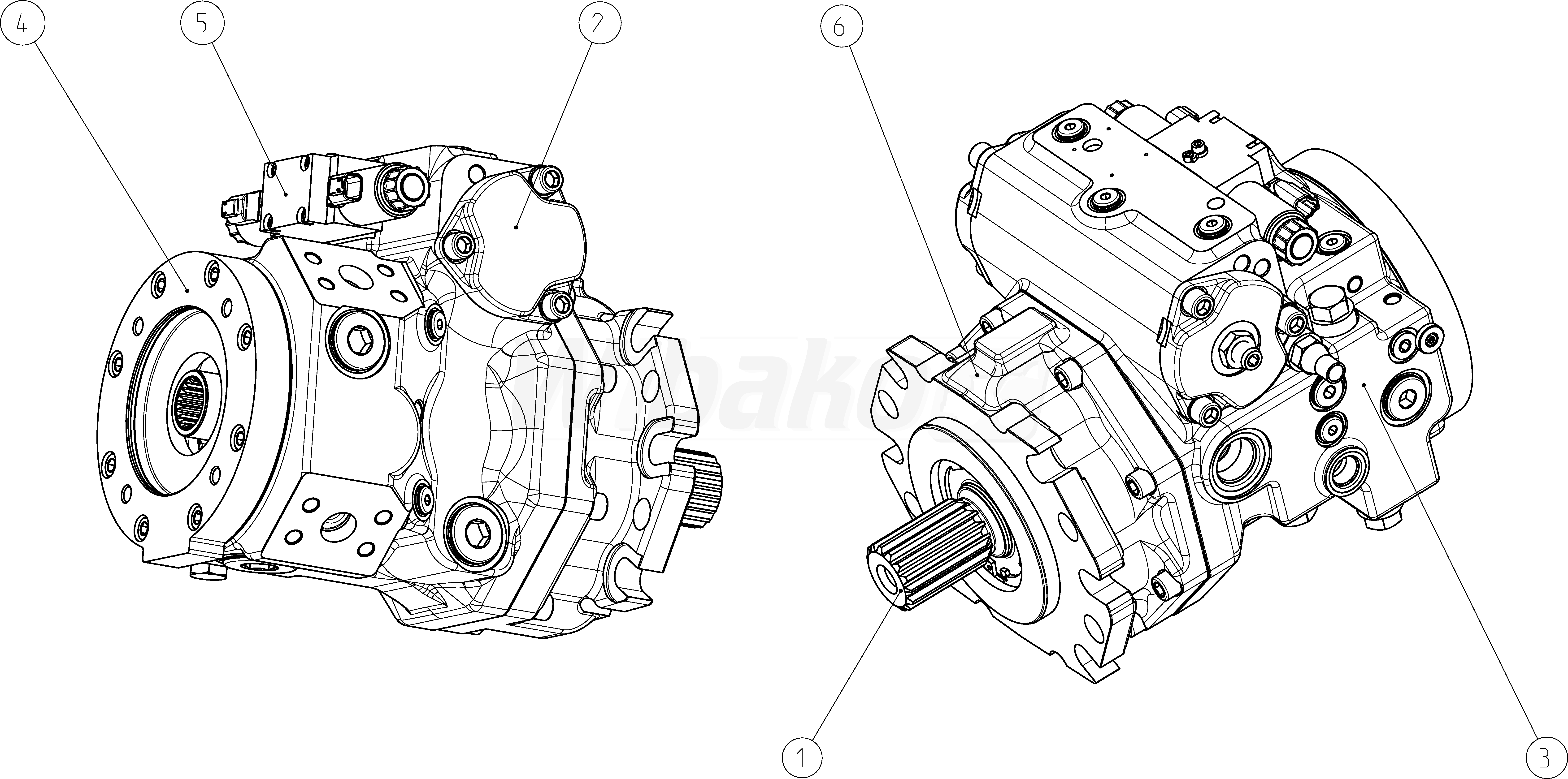 Axial piston variable pump A4VG, swashplate design, nominal pressure 450 bar, maximum pressure 500 bar. Pump, closed circuit. Geometric displacement 110 cm3. Proportional control, electric U = 24 V. Pressure cut-off, with bypass. Fixed setting, hydraulic, mechanical. DEUTSCH molded connector, 2-pin – without suppressor diode. Without swivel angle sensor. Without additional function. Without DA control valve. Series 40. Metric ports according to ISO 6149 with O-ring seal, metric fastening thread according to DIN 13. Direction of rotation: clockwise (viewed on drive shaft). Sealing material: NBR (nitrile rubber), shaft seal in FKM (fluoroelastomer). Mounting flange SAE J744 152-2/4. Splined shaft ANSI B92.1a–1976 2 in 15T 8/16DP. SAE working port A and B, on left side (45° left). Standard rotary group, without boost pump. Flange SAE J744: diameter- 127-4 (C), mounting- squarely, code- C4. Hub for splined shaft: diameter- 1 3/8 in 21T 16/32DP, code- V8. High-pressure relief valve, direct operated, fixed setting, with low-pressure relief valve, fixed setting. External boost pressure supply.